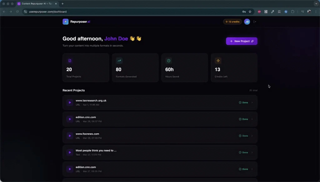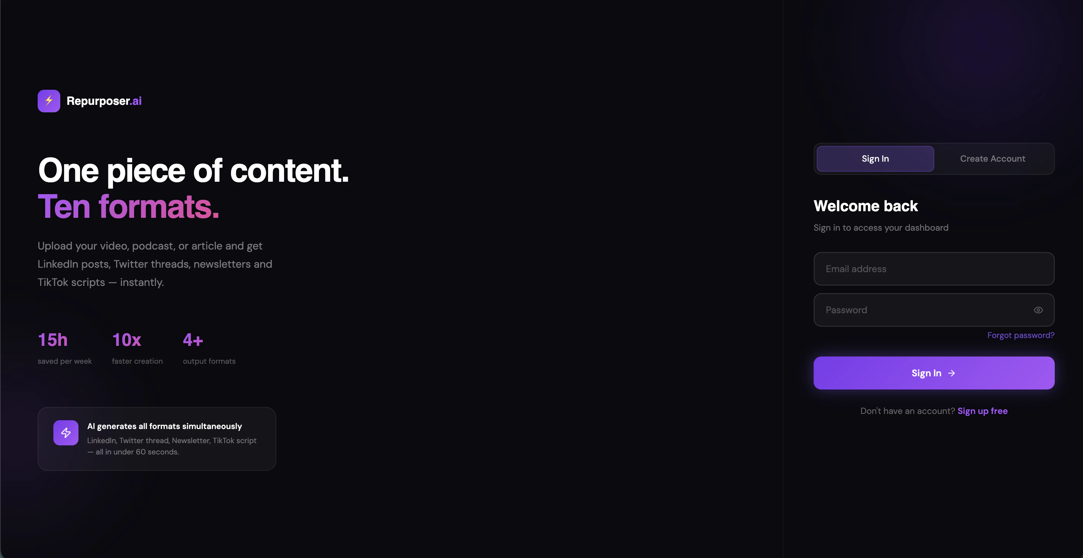 Upload a video, podcast, or article and get TikToks, Twitter threads, LinkedIn posts, and newslet...
