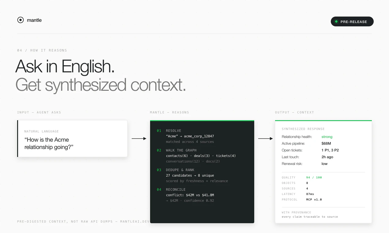 mantle reads your enterprise data in place — CRM, warehouse, docs, chat — and serves quality-scor...