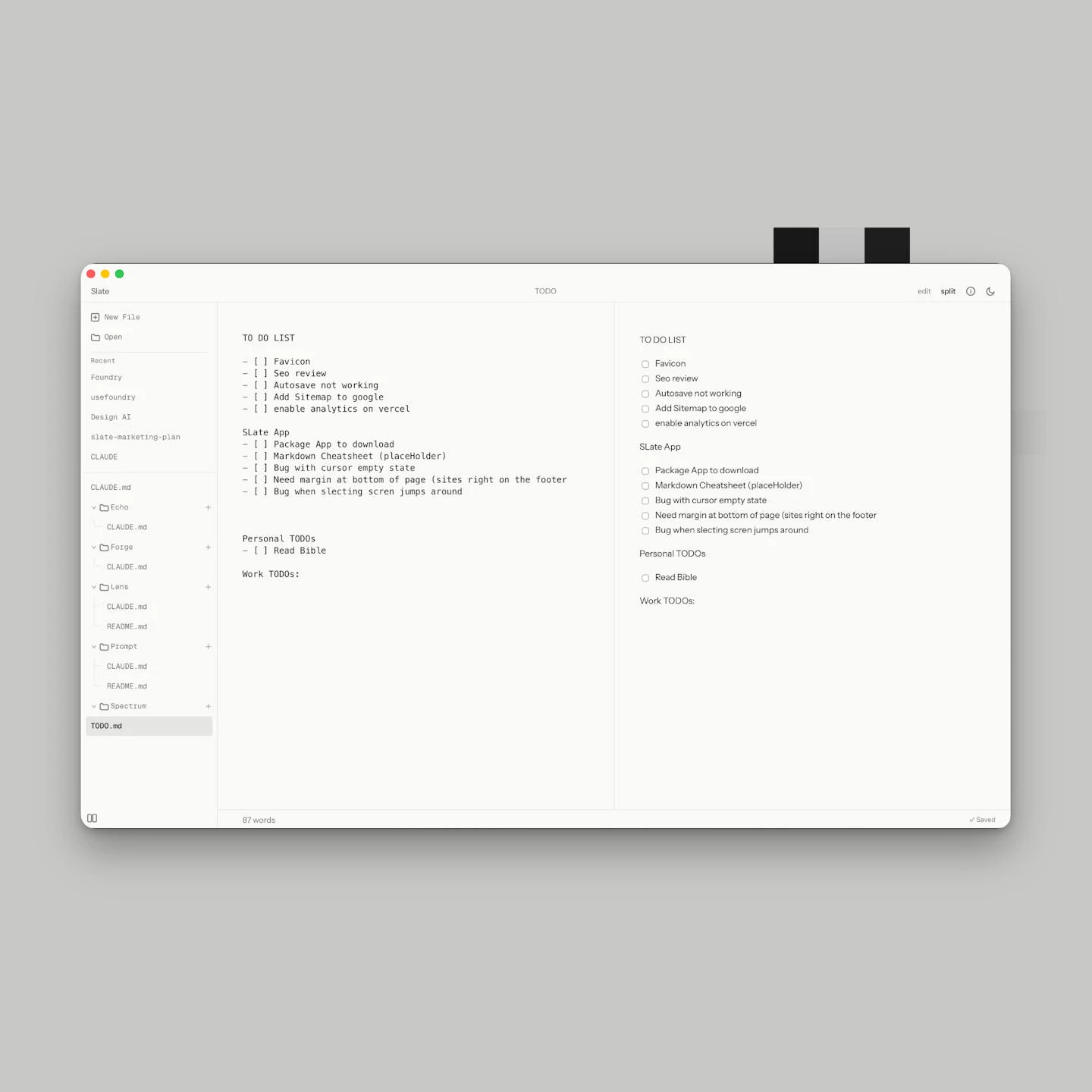 Slate is a dead simple macOS markdown editor that turns your messy notes into a living, agent-nav...