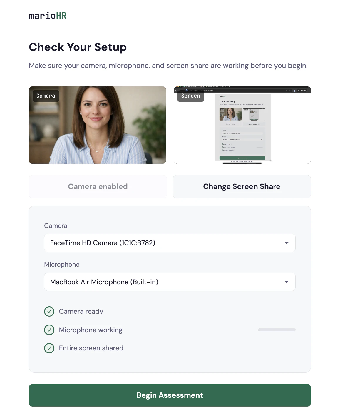 MarioHR sits on top of your ATS (Greenhouse, Ashby, etc.) and runs structured technical assessmen...