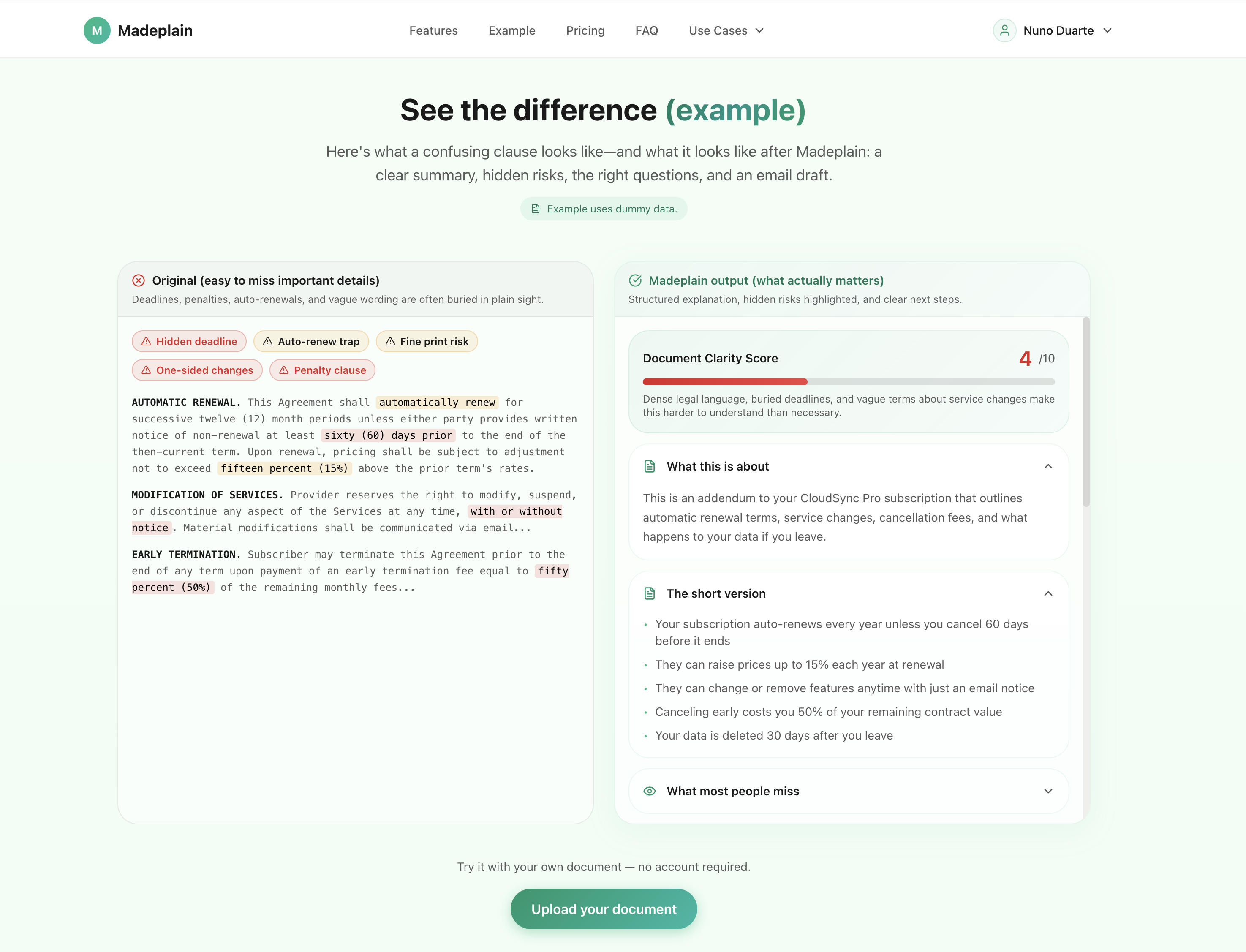 Madeplainは文書を平易な言葉で実際に何を意味しているのかを説明し、あいまいさを取り除くべき質問を明確に浮かび上がらせます。さらに回答を得るために送れる丁寧なメールを下書きする機能も提供します。契約書・雇用オファー・賃貸契約・ポリシー・長文メールなど、必ずしも難解というわけではなく“分かりにくい”だけの文書を対象とします。要約だけでなく、具体的な質問と返信の第一歩となるメール案をセットで提示する点が特徴です。これにより、誤解を減らし、適切な交渉や意思決定をサポートします。