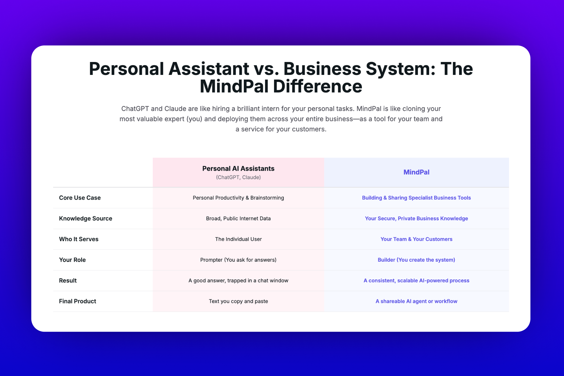 MindPalは、あなたの専門知識を武器に、マルチエージェントワークフローと独自の知能を組み合わせ、天才を24/7でチームとクライアントへ届けます。個人向けAIや機械的ツールとは異なり、知識ベース・フレームワーク・意思決定ツリーをエージェントにコード化。マルチモデル・マルチモーダルで推論・作成・分析を統合。ネイティブなMCPサポートで任意API・データベース・ツールへ接続、拡張性を確保。人間介入を前提に品質を管理。展開先はウェブサイト・社内ツール・クライアントポータル等。現在50k以上の専門家ベースの企業が活用。