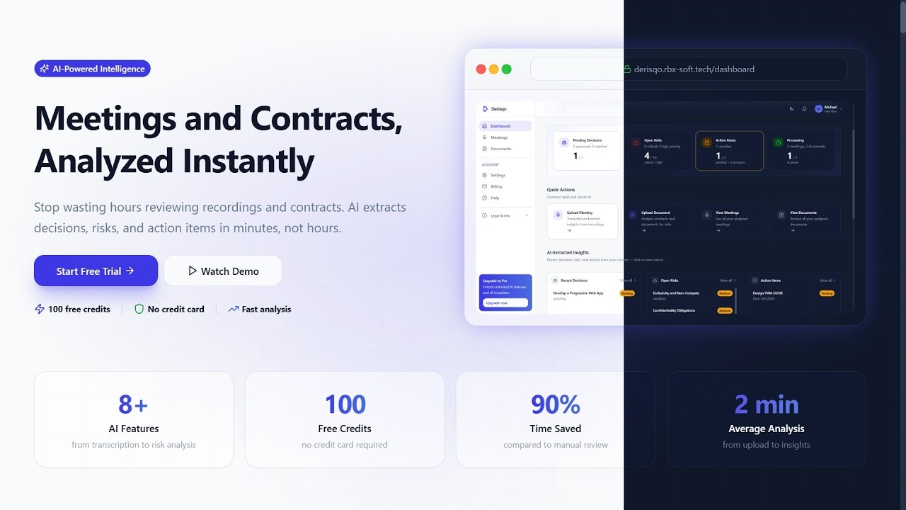 Derisqoは会議の文字起こし、アクション項目の抽出、契約リスクの特定、文書のAI比較を提供。機密データは自動赤字化され、処理はメモリ上のみで行われる。