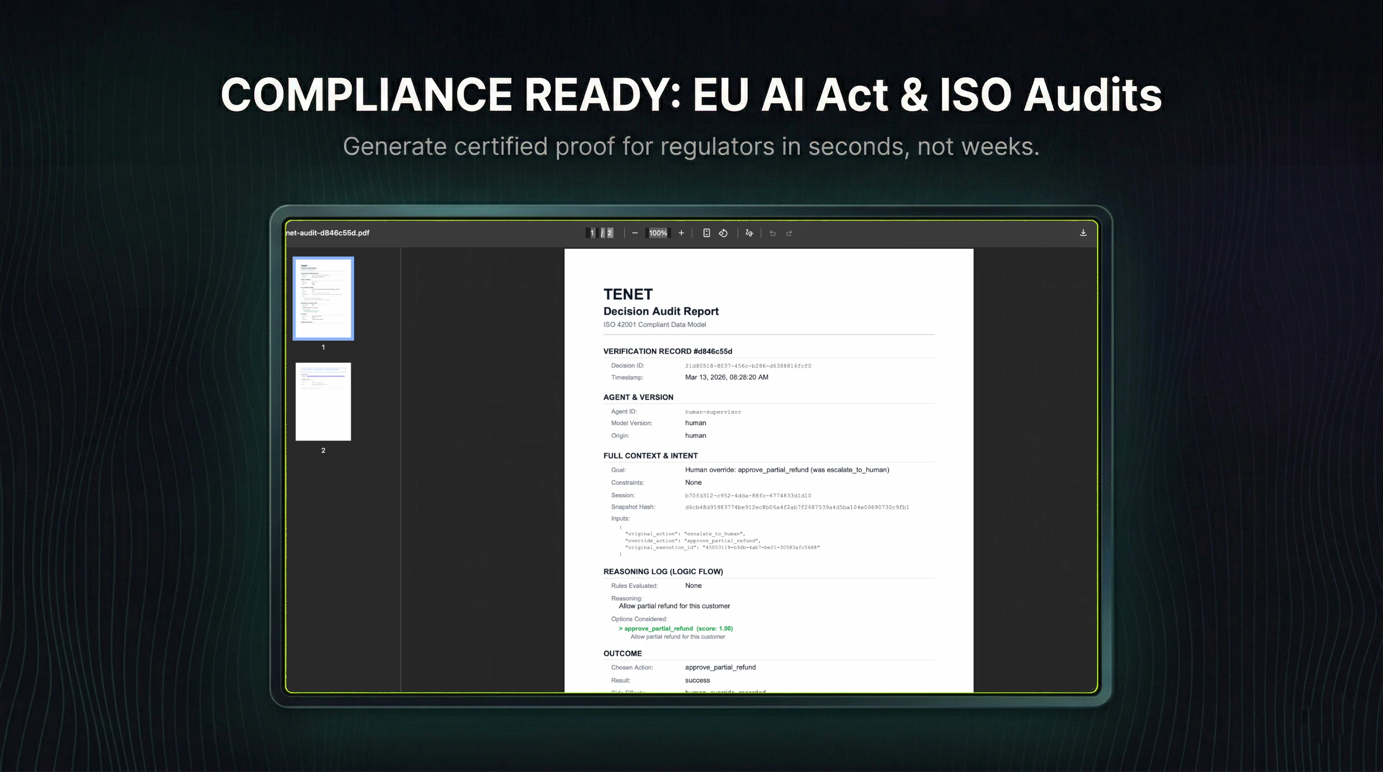 Go beyond observability. Tenet is the Decision Auditability Platform for high-stakes AI that turns your agent's black box into a provable, ISO-ready Reasoning Ledger. First decision-centric layer for AI agents, built on three pillars: 1. PROOF. Capture every agent decision permanently on-ledger. 2. VERIFICATION. Replay & re-execute decisions semantically. 3. IMPROVEMENT. Every error & Human Override → structured fine-tuning data. Prove compliance with EU AI Act, SOC2 & HIPAA — in 2 lines of code