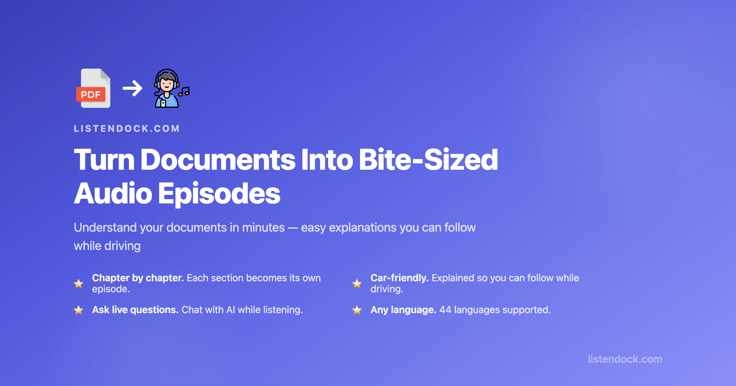 Get the key insights from any document in minutes — or listen to the full original. Convert PDFs to high-quality audio in any language. Turn PDFs, papers, and articles into short audio episodes with simple AI explanations. Listen chapter by chapter while driving or walking, and ask questions as you go. Works in any language.