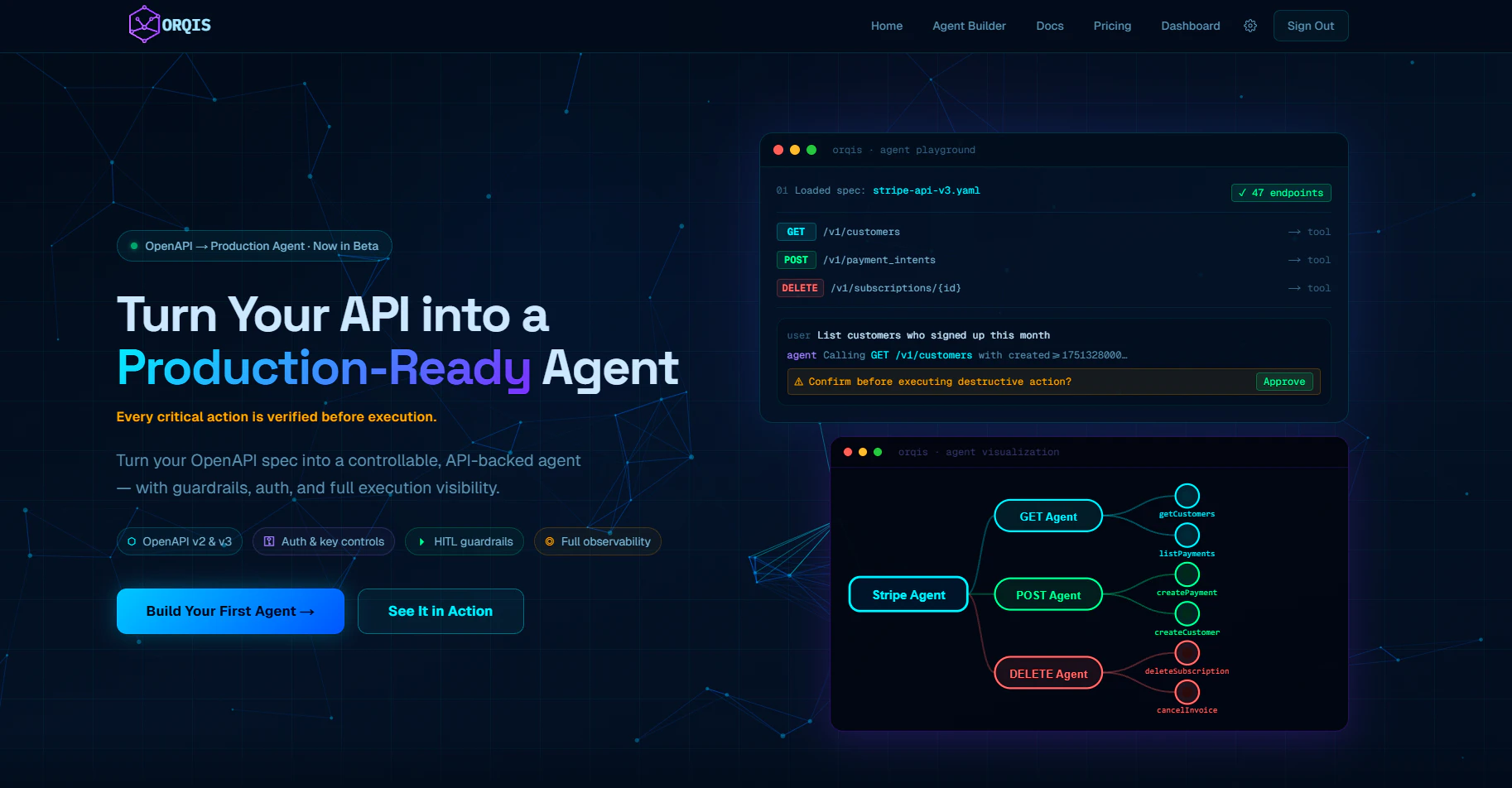 Orqis turns your OpenAPI spec into a controllable, observable AI agent, no infrastructure required. Paste your spec, choose an LLM (OpenAI, Anthropic, Gemini, Mistral, Groq), and your agent is live. Endpoints become tools, sensitive actions require confirmation, and every call is fully traced. Built for real-world use: scoped auth, encrypted secrets, guardrails for destructive operations, and an API to embed agents into your own products. Free to start. No credit card required.