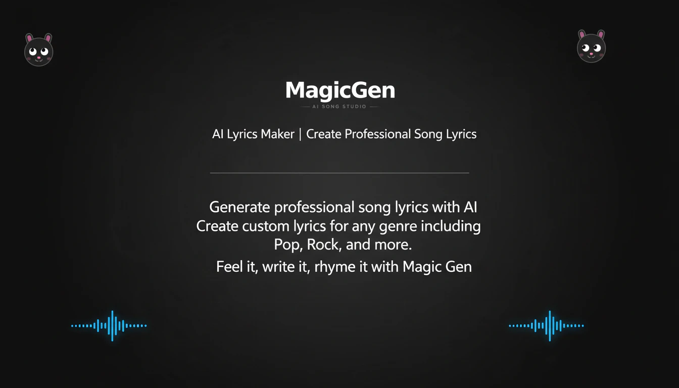 Generate professional song lyrics with AI. Create custom lyrics for any genre including Pop, Rock, and more. Feel it, write it, rhyme it with Magic Gen.
