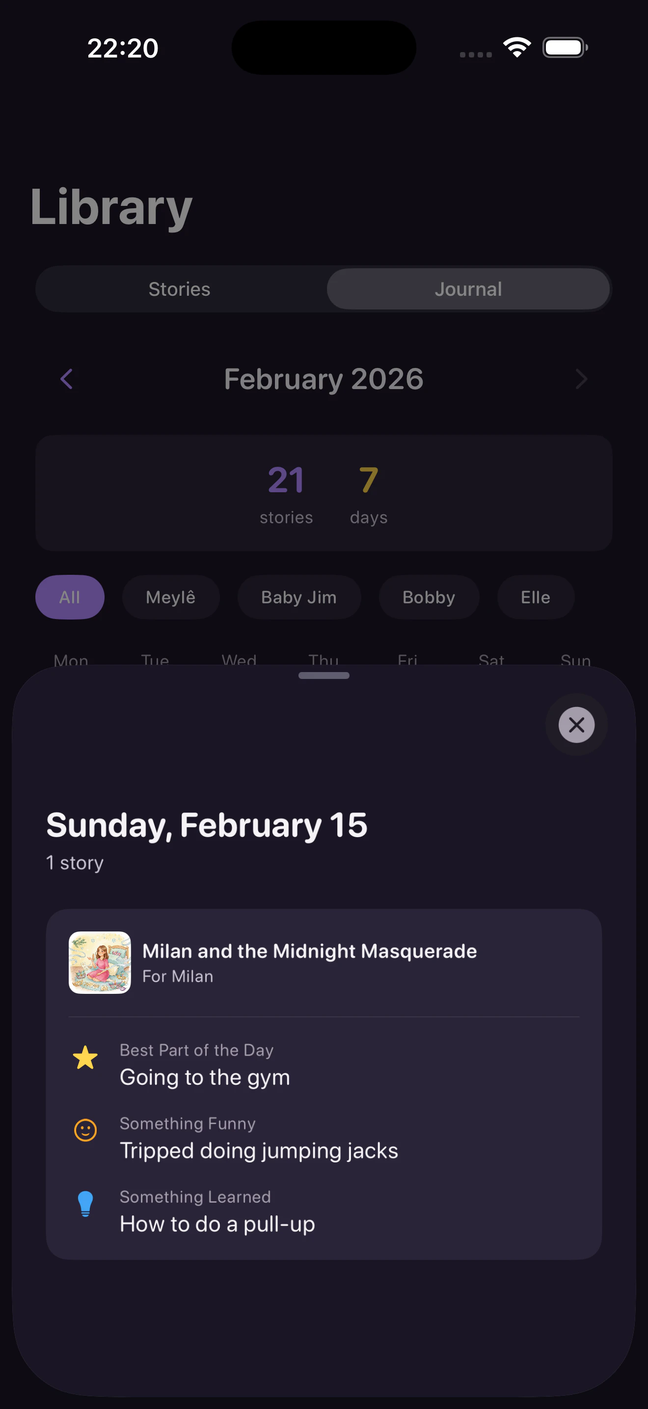 Every night, Storynite turns your child's real day into a unique, watercolor-illustrated bedtime story where they're always the hero. Share moments from their day, and it creates a one-of-a-kind adventure starring their custom-built avatar character. The secret: what starts as storytelling quietly becomes a gratitude journal with a calendar of memories to revisit together. Stories generate natively in 23 languages. Siblings can co-star, and favorites export as printed keepsakes.