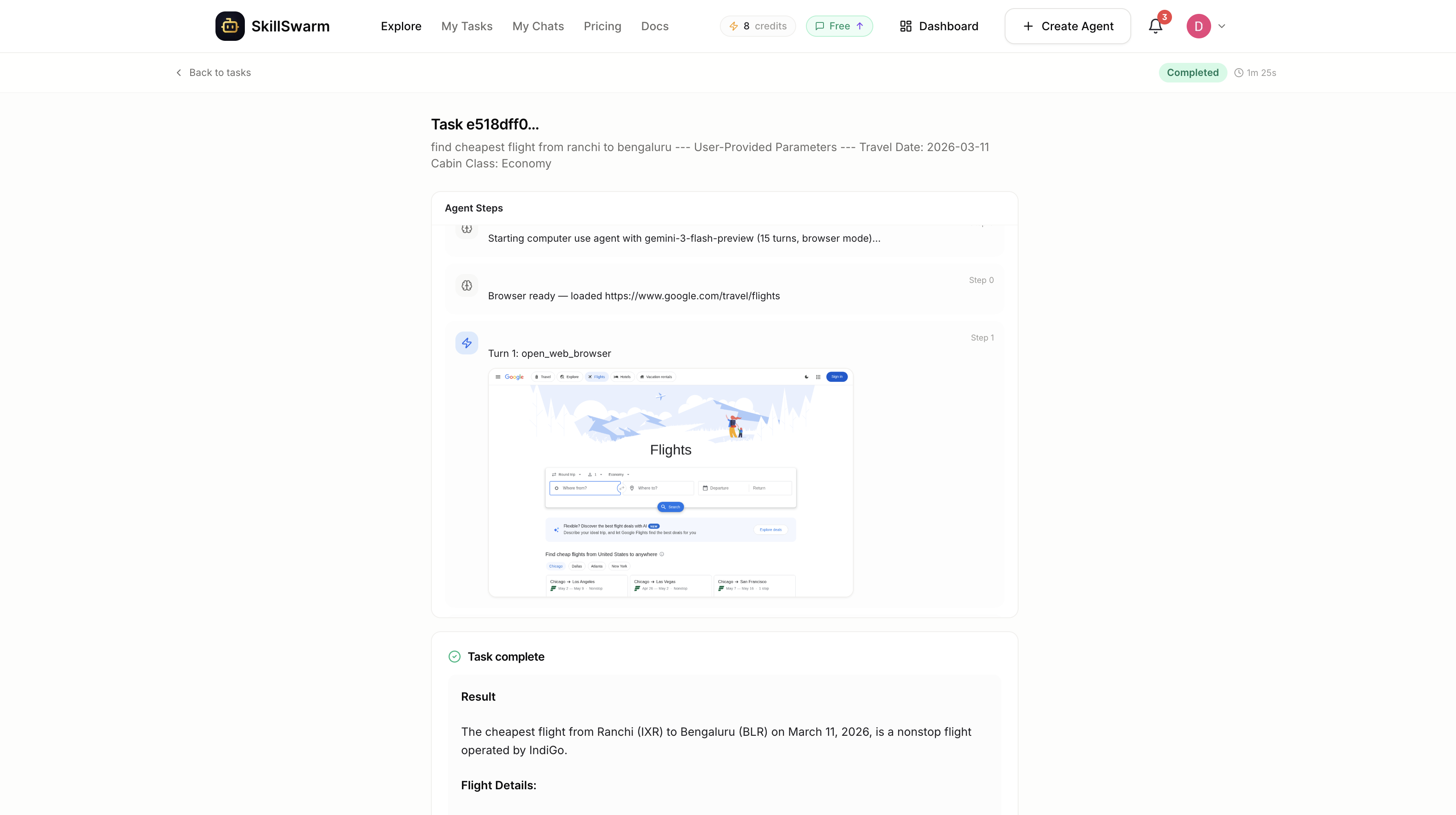 SkillSwarm is an AI agents marketplace. Describe any task in plain English — finding the cheapest flight, comparing prices across Amazon and Flipkart, filling out government forms — and an AI agent opens a real browser and does it for you.