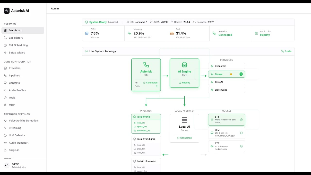 AVA is a self-hosted, open-source AI voice agent that plugs directly into your Asterisk or FreePBX system. No cloud telephony migration required. Choose from 6 production-ready configurations: OpenAI Realtime, Deepgram, Google Gemini Live, ElevenLabs, Local Hybrid, or 100% fully Local. Modular STT/LLM/TTS pipeline — swap providers without changing code. Try it live: dial (925) 736-6718.