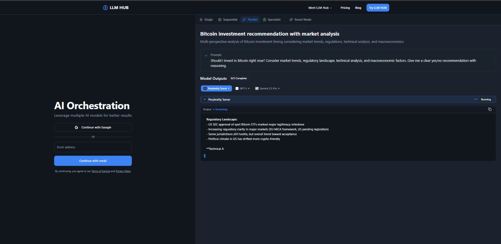 ## プロダクト概要 LLM HUBは、複数のAIモデルを一度のプロンプトで組み合わせた画期的なプラットフォームです。主な特徴は次の通りです: - **多くのAIモデルを活用**:GPT-5、...