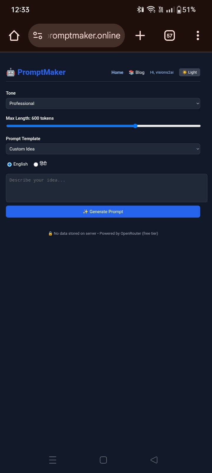 PromptMaker は、ヒンディー語と英語の両方に対応する100%無料・オープンソース風のAIプロンプト生成ツールです。OpenRouter の無料モデルを自動フォールバックで利用し、ログイ...