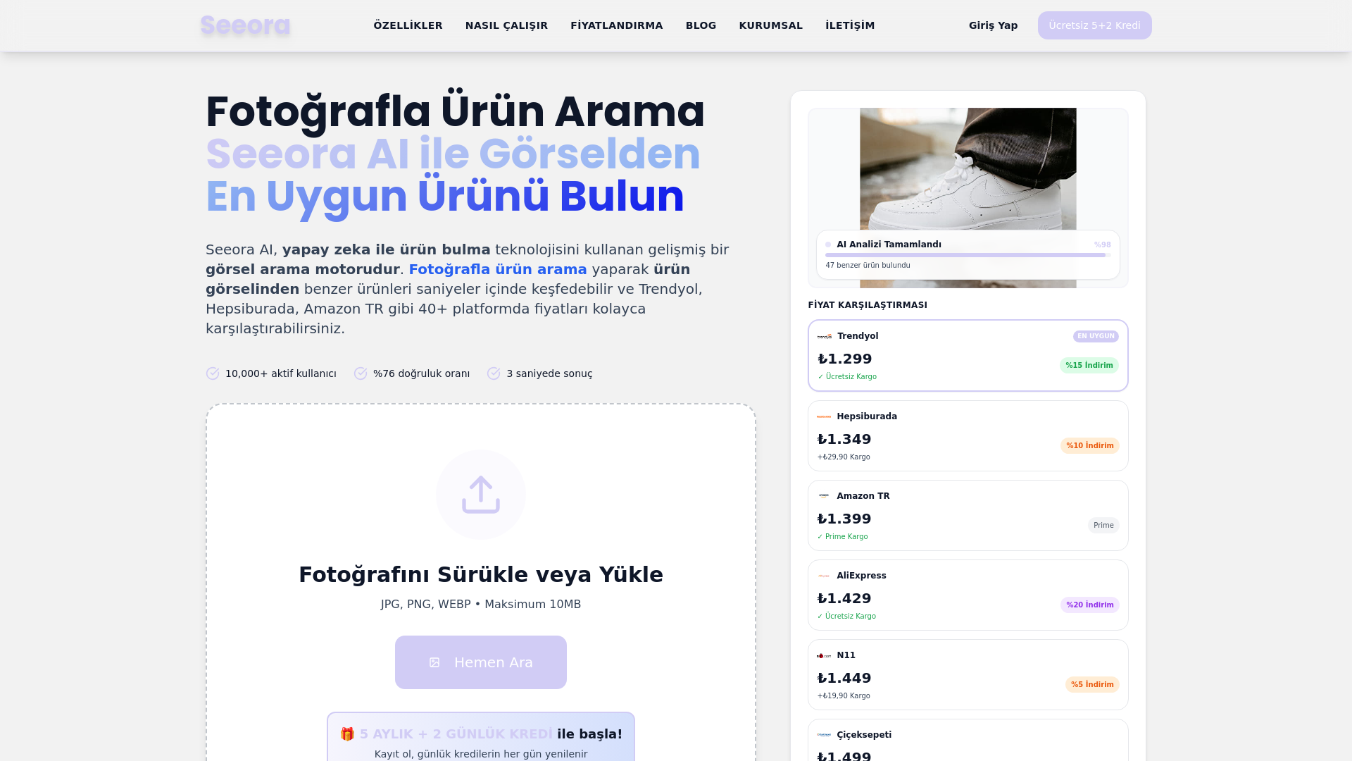 Seeora AIは、写真をアップロードするだけで40以上のECプラットフォームから最適な商品を見つけられるAI搭載のビジュアルショッピングアシスタントです。画像を解析して一致・類似商品を検出し...