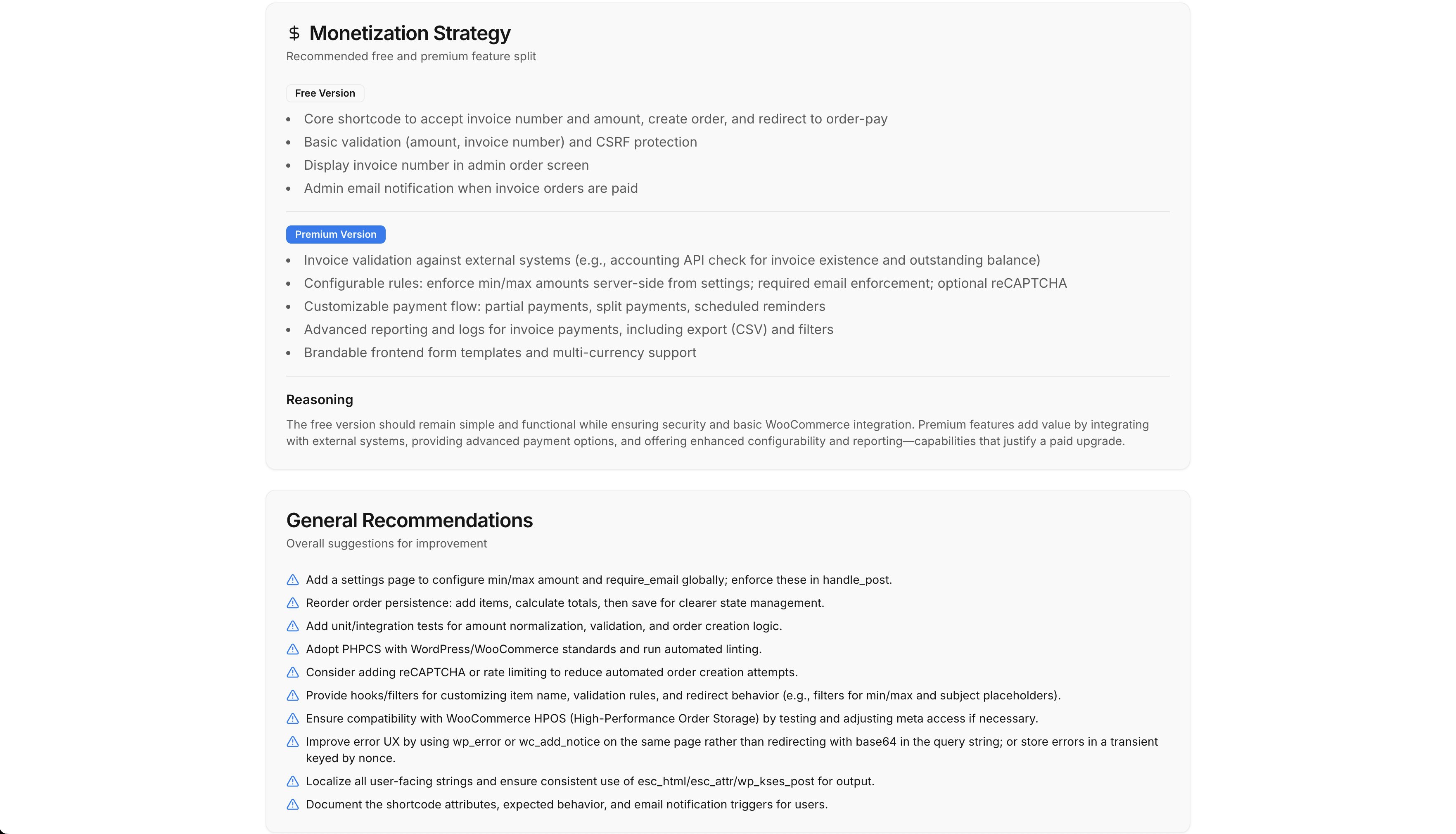 このプロダクトは、AIを活用してWordPressプラグインを総合分析するツールです。主な機能は、AI搭載のコードレビュー、セキュリティ監査、機能推奨の提供。プラグインの品質向上と安全性確保をサ...