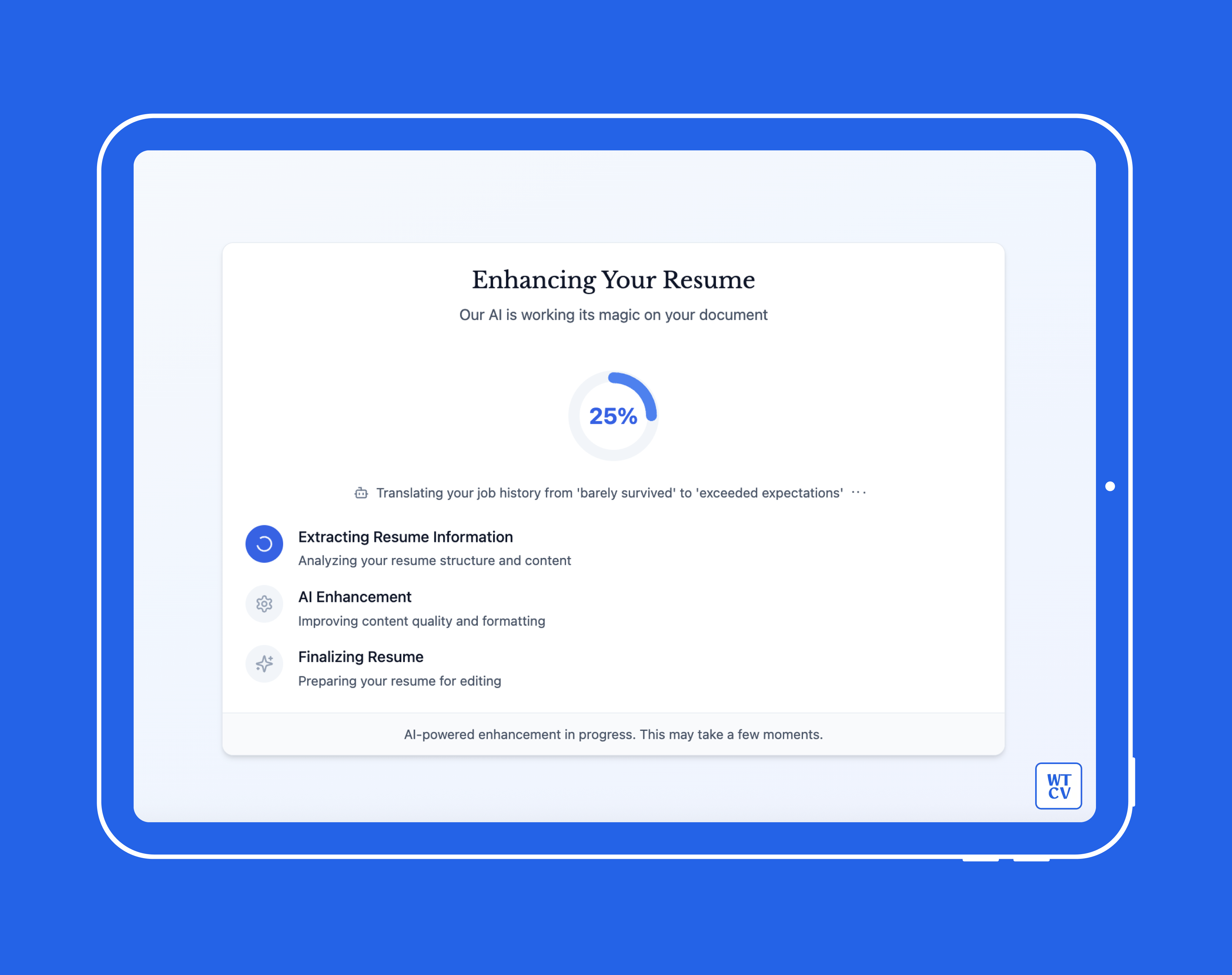 WhatTheCVはAI搭載の履歴書作成・分析・最適化プラットフォーム。 ATS対策を意識したテンプレートと即時フィードバックで応募成功を目指す。 求職者と採用者の双方の視点を取り入れ、応募者に...