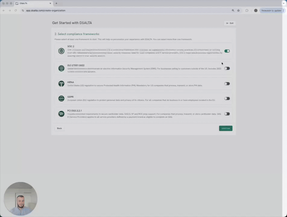 ## 概要 DSALTAは SOC2/ISO27001/GDPR 対応を AI エージェントで自動化するツールです。ポリシー草案の作成、ベンダー検出、リスク評価、リスク登録簿の構築、統合の接続、...