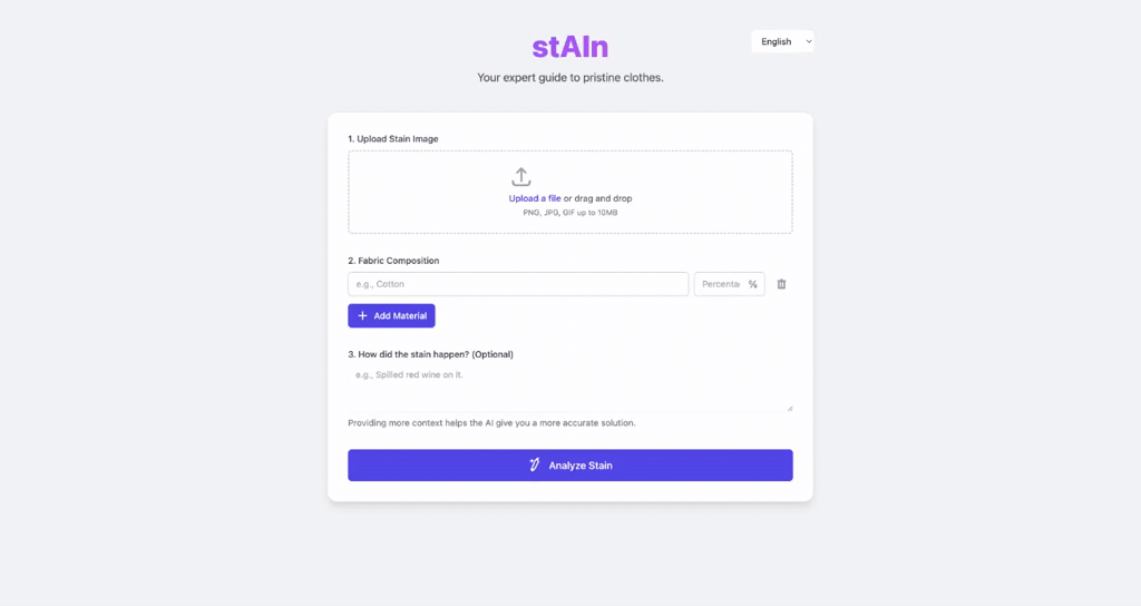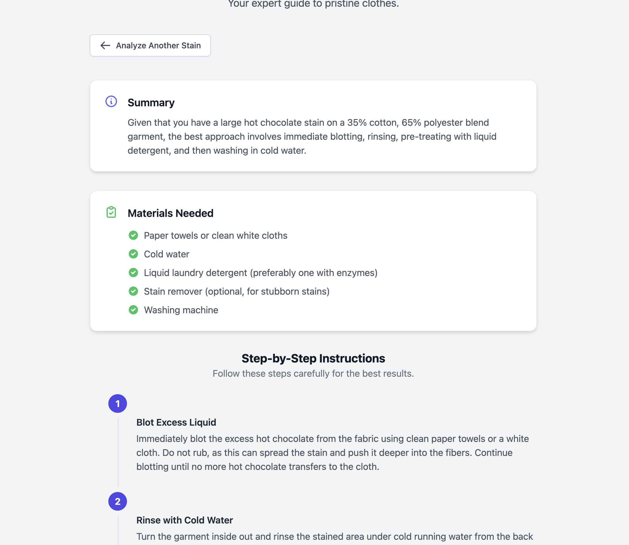 AI搭載の衣類シミ取りガイド。写真と生地情報を入力すると、即時でステップバイステップの清掃手順を提示します。写真アップロード→生地タイプと割合の入力→任意でシミの種類を指定する流れ。実用性に優れ...
