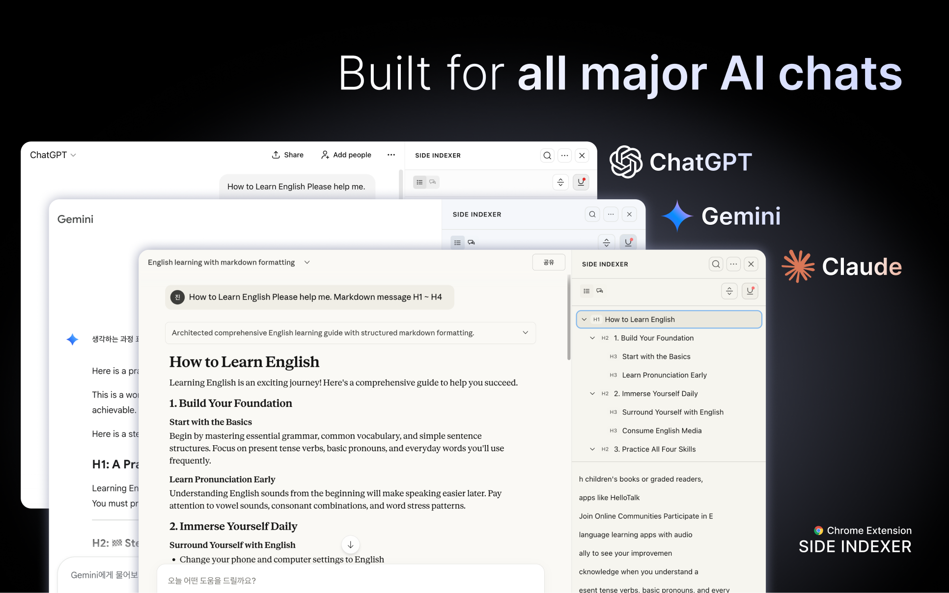 ##概要 Side IndexerはAI会話を自動的に構造化して、動的な目次として整理します。ChatGPT、Claude、Geminiに対応し、会話全体を横断して機能します。自動見出し、クリッ...