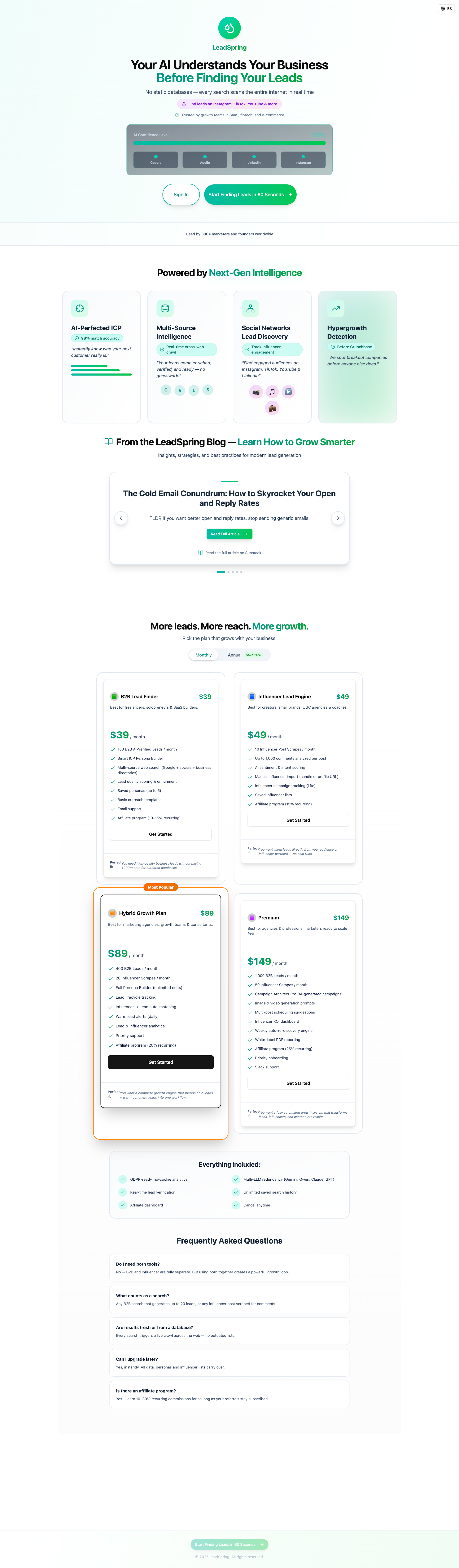 LeadSpringは最新のリードをライブウェブからリアルタイムで取得するAIリードエンジンです。ICPはAI質問票で自動作成し、適合リードを即座にマッチ。インフルエンサー生成リードの追跡、フォ...