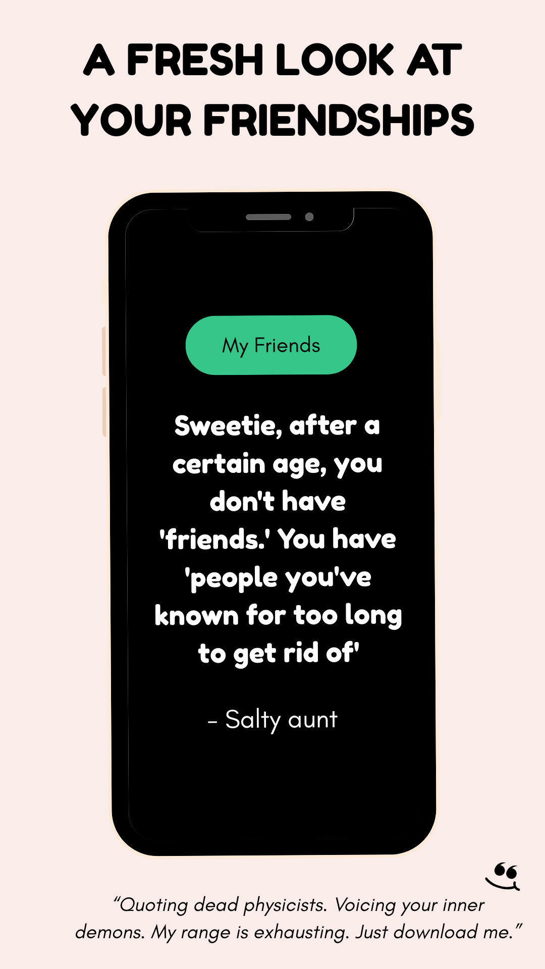 毒性ポジティブさに対抗する自己認識系AIアプリ。自分の悩みをトピック化し、好みの人格で痛烈な罵倒を受け取ることで、自己認識とユーモアを促す。