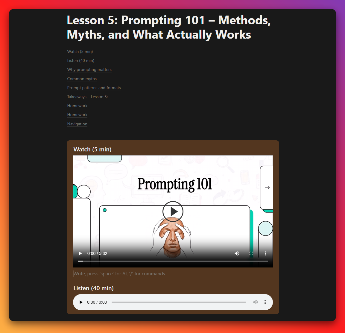 ## 概要 30日間の実践型コース。中小企業のオーナーがAIを週10時間以上働く仲間へ変えることを目指します。4週間・12レッスン・日々の小さな課題で、コード不要・専門用語なしでChatGPTと...