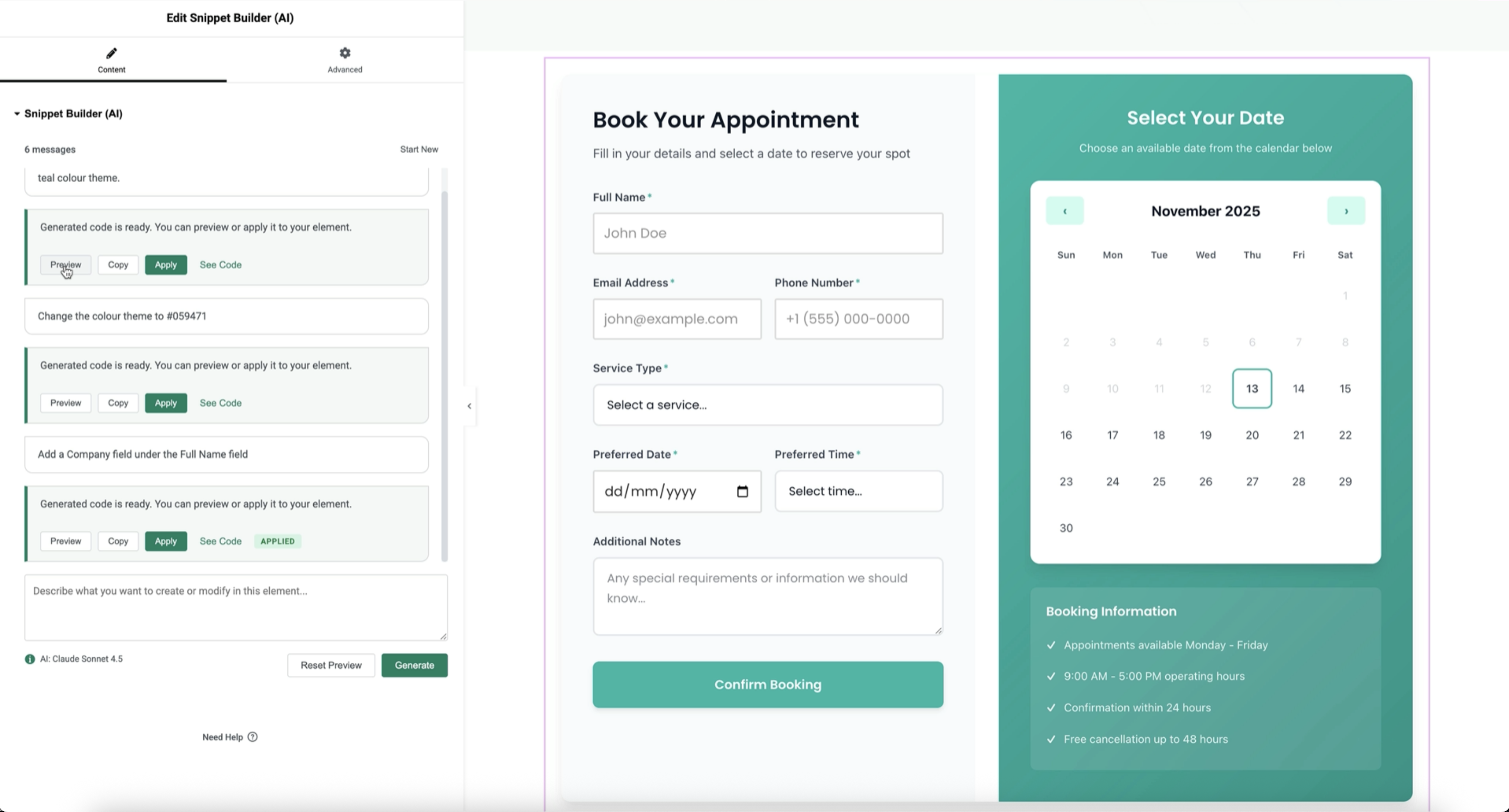 WP Snippets AIは、WordPress向けのコード生成に特化した軽量プラグイン。Elementorと連携し、ドラッグ&ドロップでAIプロンプトを作成。生成されたコードはPreview...