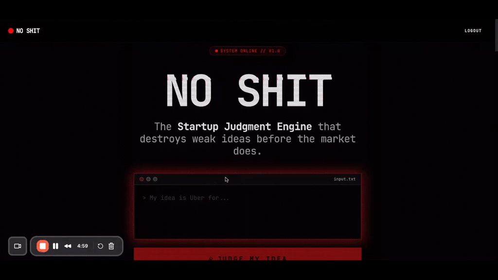 No Shitは、起業初期のアイデアを速く率直に評価するためのツールです。アイデアを入力すると、仮想のCTO/CMO/CFO/法務/ピッチ/成長/心理エージェントが、無駄のないストレートなアドバ...