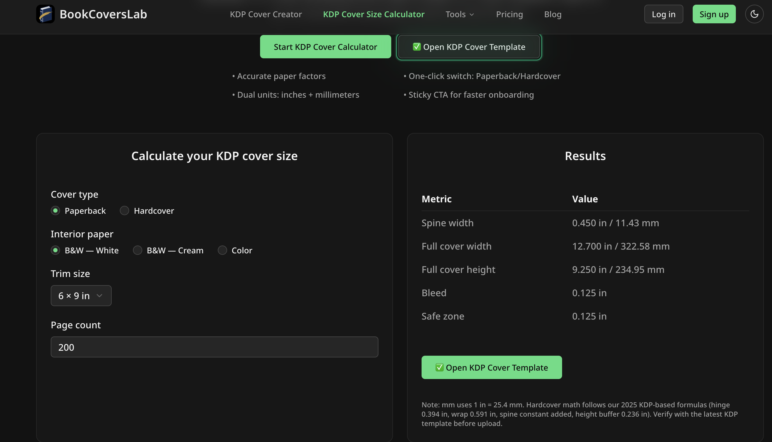 ## 概要 BookCoversLabはKDP向けのカバー計算機と作成ツール。リアルタイムのカバーサイズ計算、背表紙・裁ち落としの自動更新、ページ数×用紙タイプの自動計算、ブランド寄りのAI背景...