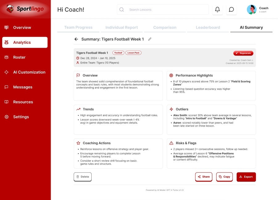 ##概要 - AI搭載のスポーツトレーニングプラットフォーム。コーチ・保護者・子どもを対象に設計。 - 10競技対応。数秒で賢い練習計画を作成し、選手の進捗を継続的に追跡。チャレンジとインタラク...