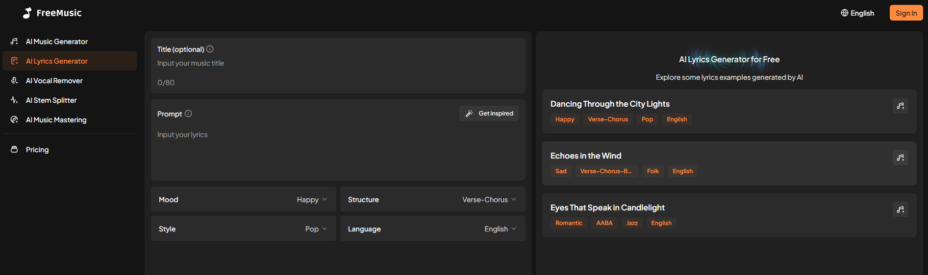 FreeMusic AI は、テキストプロンプトからオリジナルのロイヤリティフリー音楽を瞬時に生成するクリエイター向けツールです。楽器不要・編集スキル不要で、長さ・ジャンル・ムードを自由に設定し...