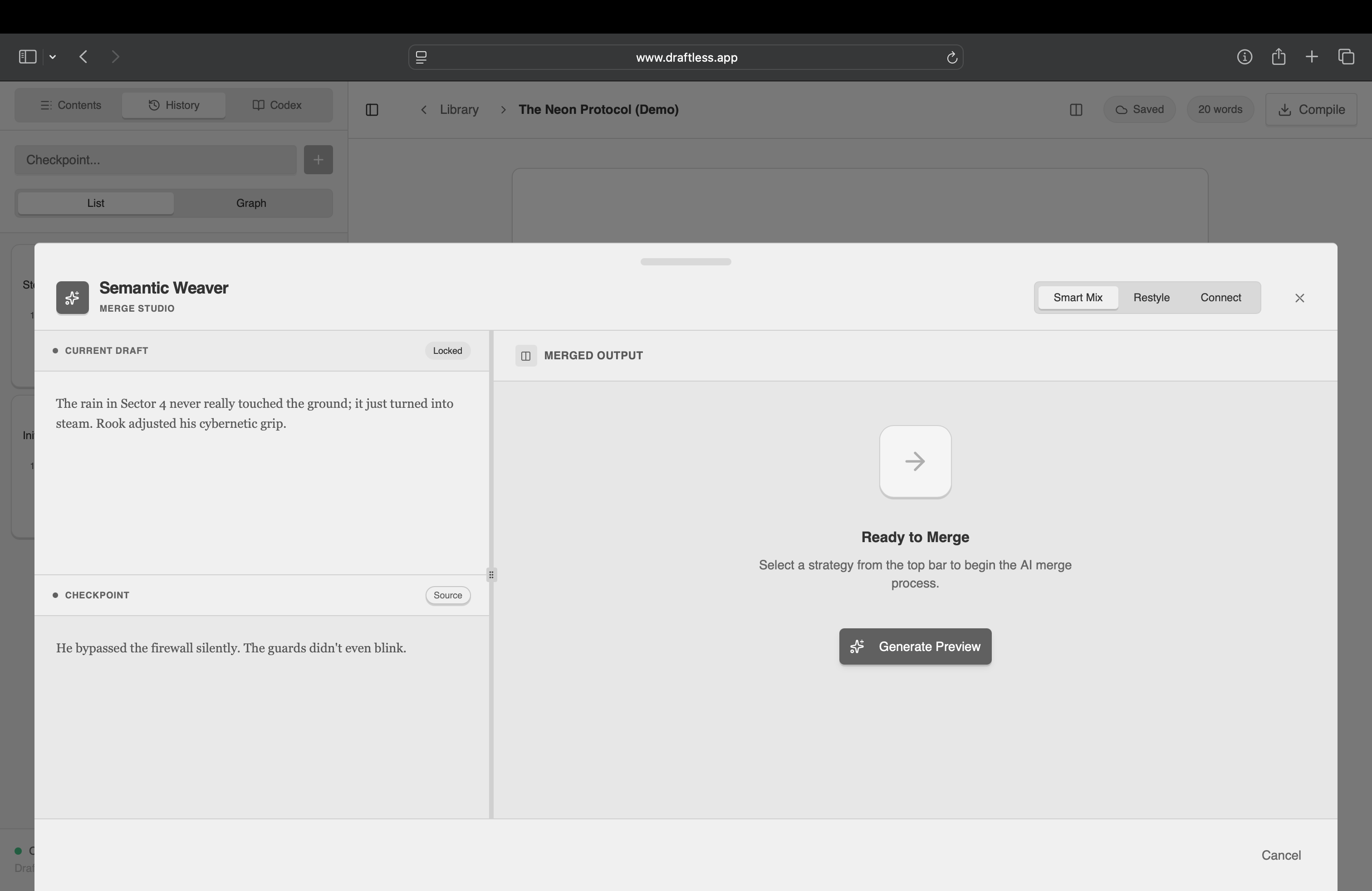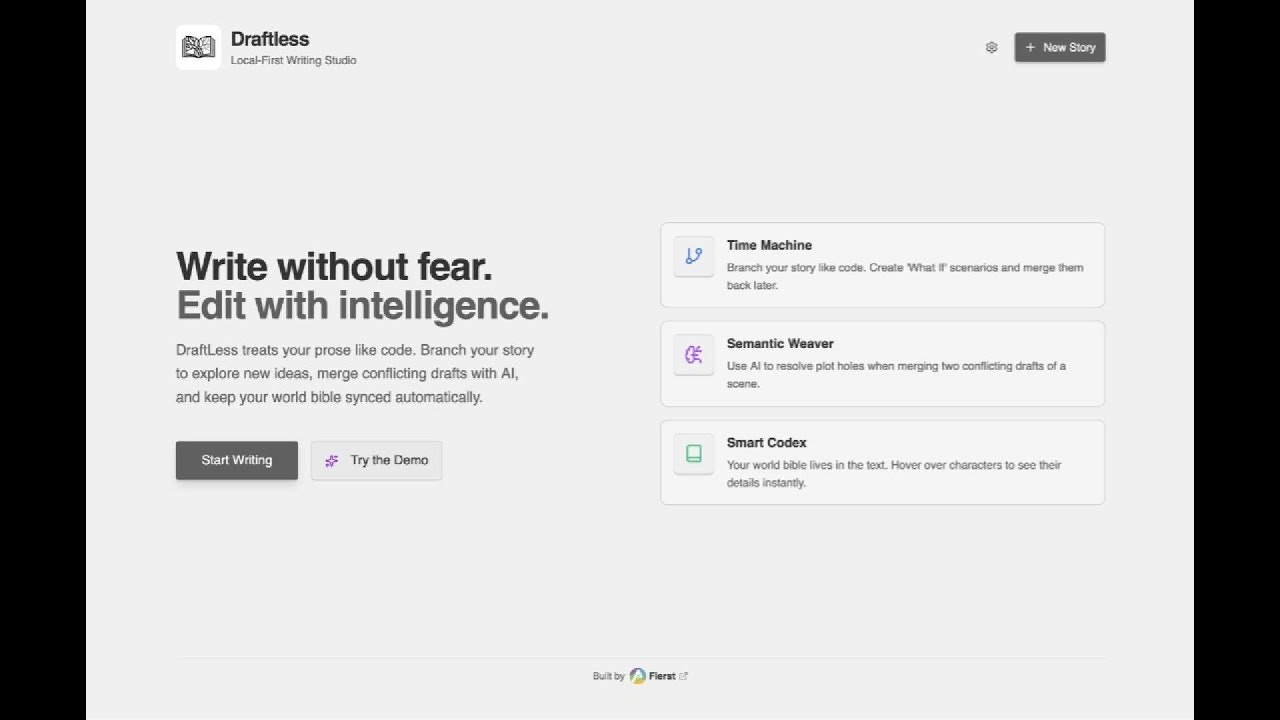 ## 概要 Draftless は作家向けの Git。線形履歴を視覚的な分岐ツリーで表示することで、メインのドラフトを失うことなく“もしも”の展開を安全に試せます。タイムマシン機能で保存点を作成...