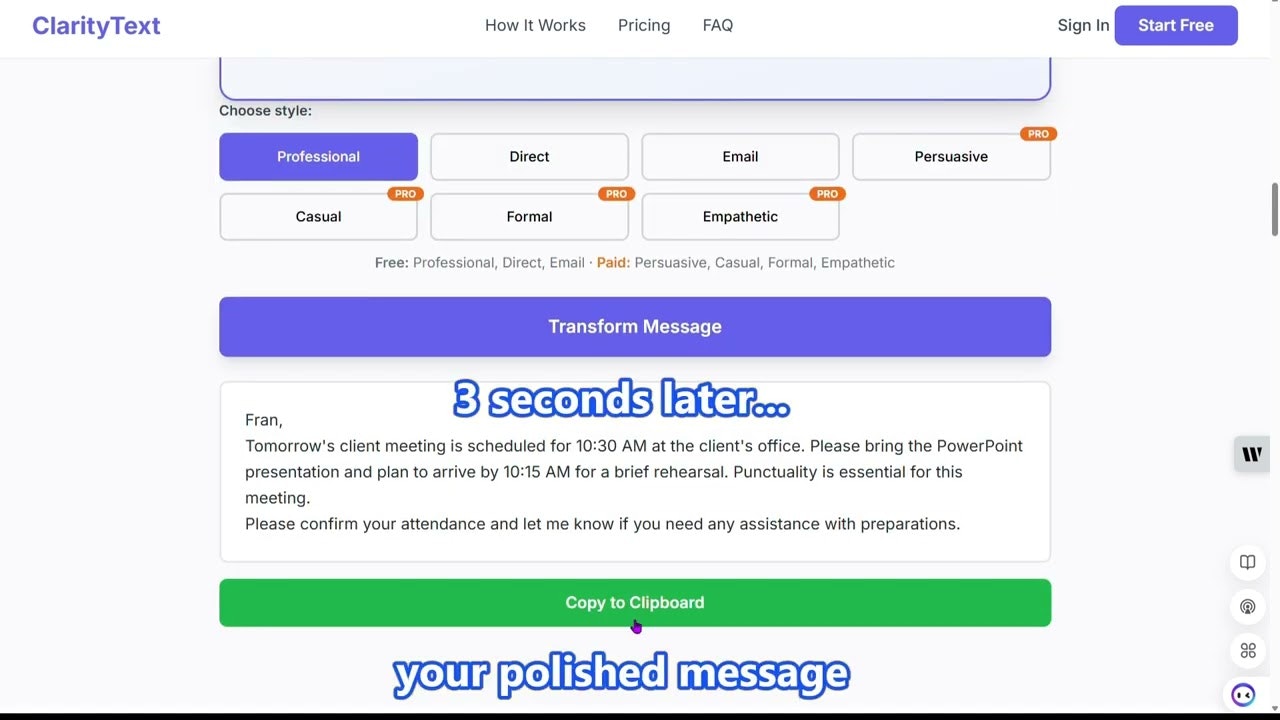 ## 概要 ClarityText は、乱れた思考を3秒で洗練されたメッセージに変換する、高速な文章生成ツールです。プロンプト設計や文脈の切替なしで、アイデアを貼り付け→書式を選択→コピーする、...