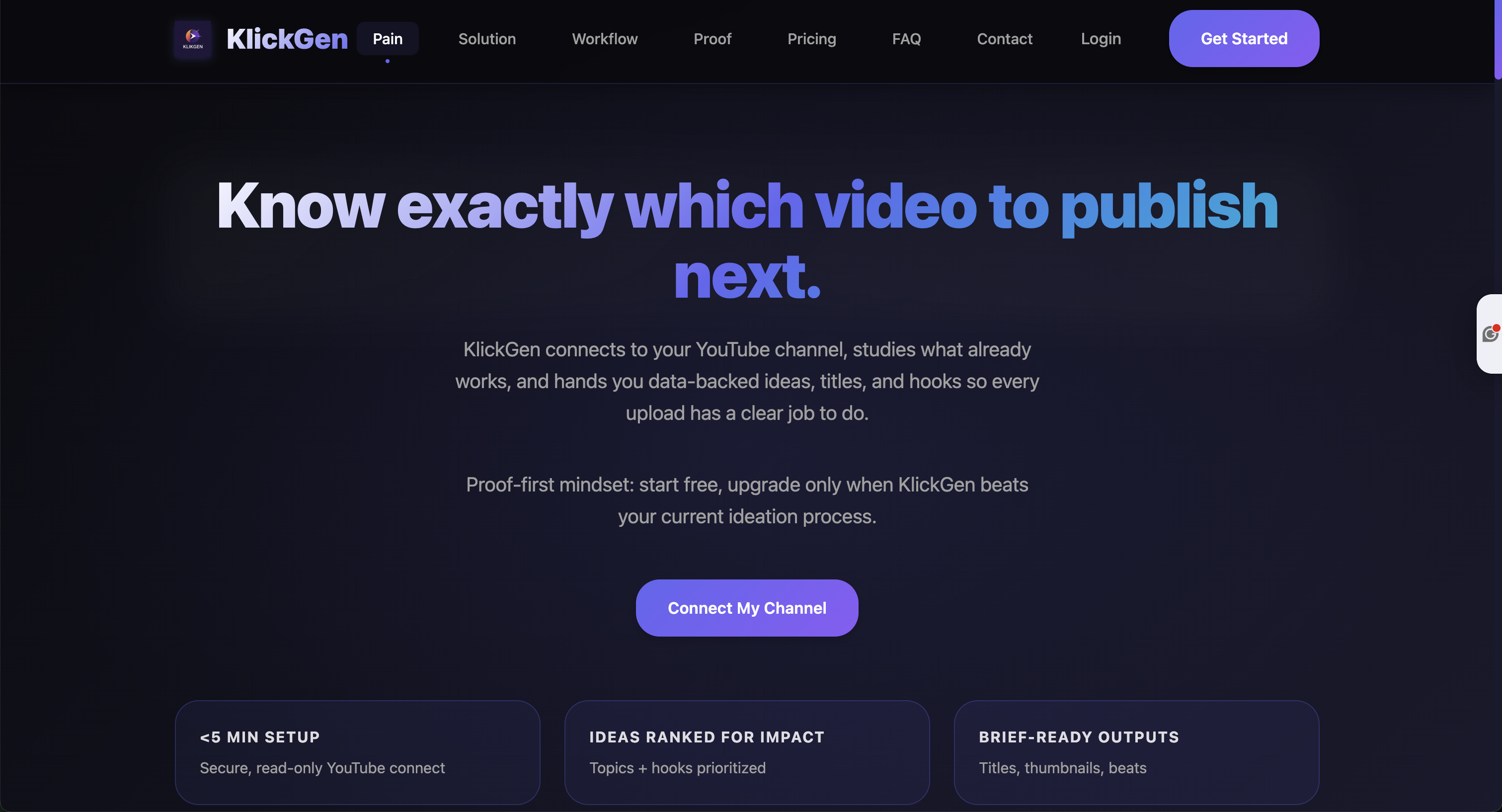 Klickgenは、YouTubeクリエイター向けのAI搭載アイデア発想ツール。チャンネル・ニッチ・リアルタイムトレンドを分析して、パーソナライズされた動画アイデア、視点、初期スクリプト案、競合...