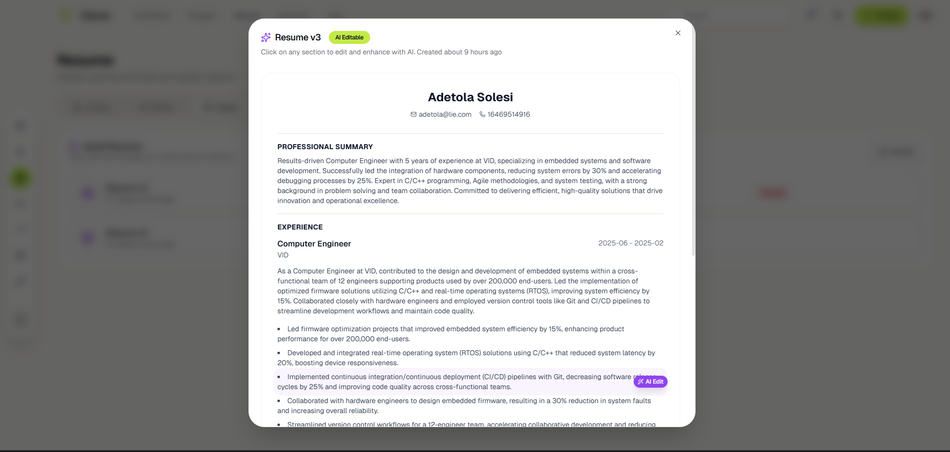 本製品はキャリア成長を加速させるAIコパイロットです。履歴書の自動作成、面接対策の準備、求人への応募支援を一つにまとめ、職種や業界に合わせた最適化を提案します。テンプレートの選択、自動添削、模擬...