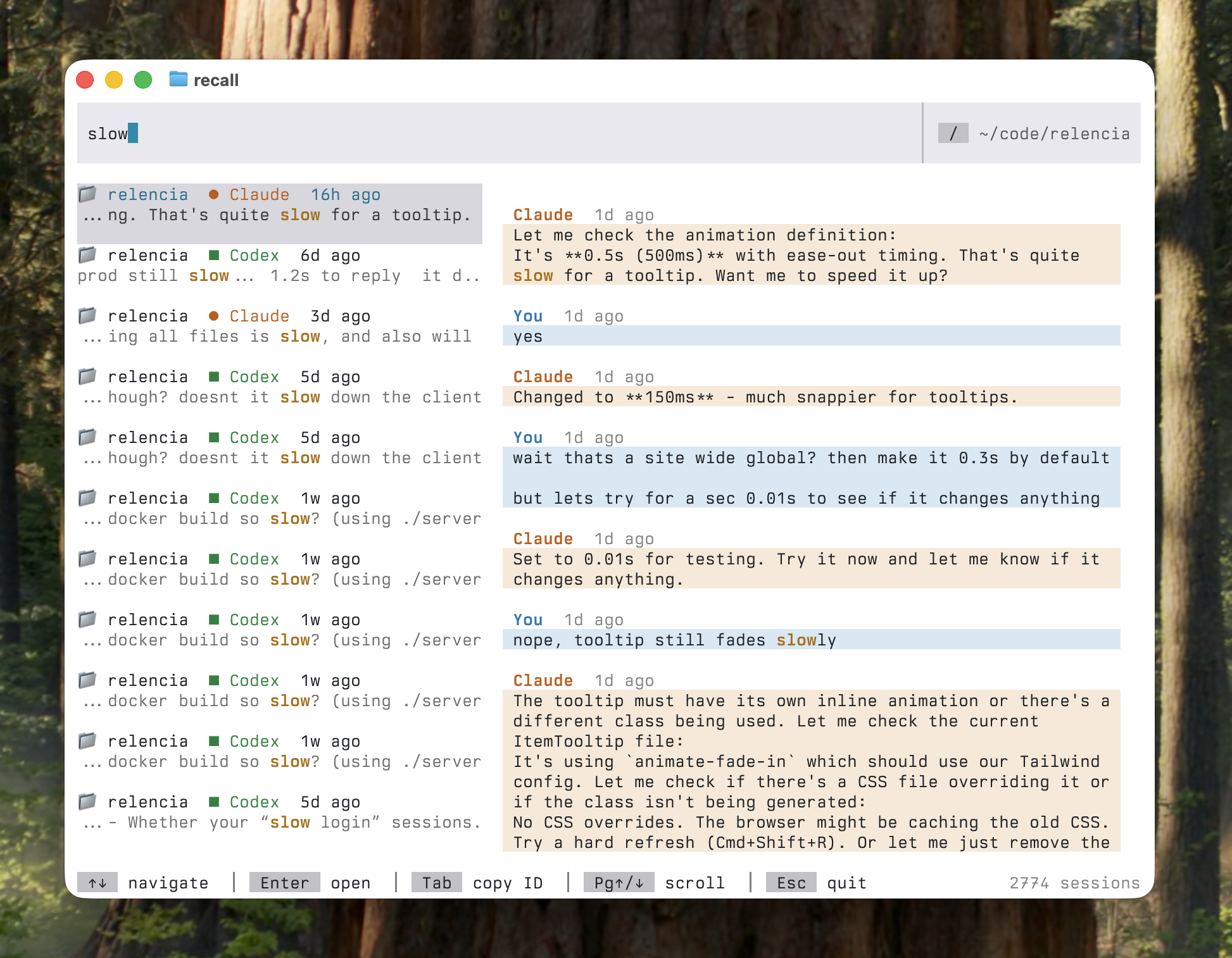 ## 概要 Claude/Codex の過去会話を全文検索して再開する、端末ネイティブのTUIです。全文検索・ハイライト・会話プレビューを備え、昔のセッションを探す手間を減らします。 ## 主...