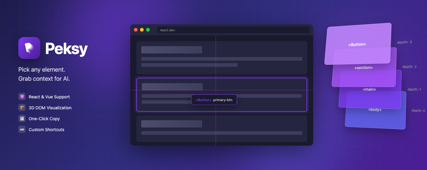## 概要 PeksyはAIコーディングアシスタント向けにDOM要素の文脈を取得する無料のChrome拡張機能です。使い方は、Cmd/Ctrl+Shiftを押しながら要素をホバー→クリックで文脈...