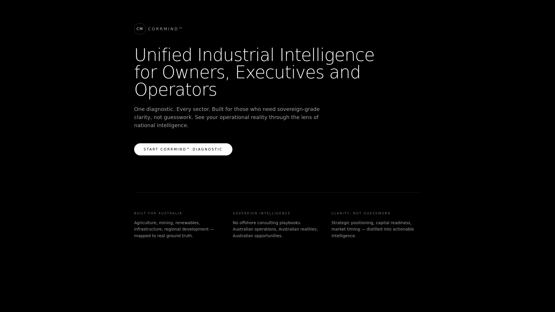 CorrMindはオーストラリアの産業オペレーター向けの統合的戦略診断ツール。農業・鉱業・エネルギー・インフラ・地域開発を横断する1つの評価で、資産・ルート・地域全体の依存関係・制約・活用ポイン...