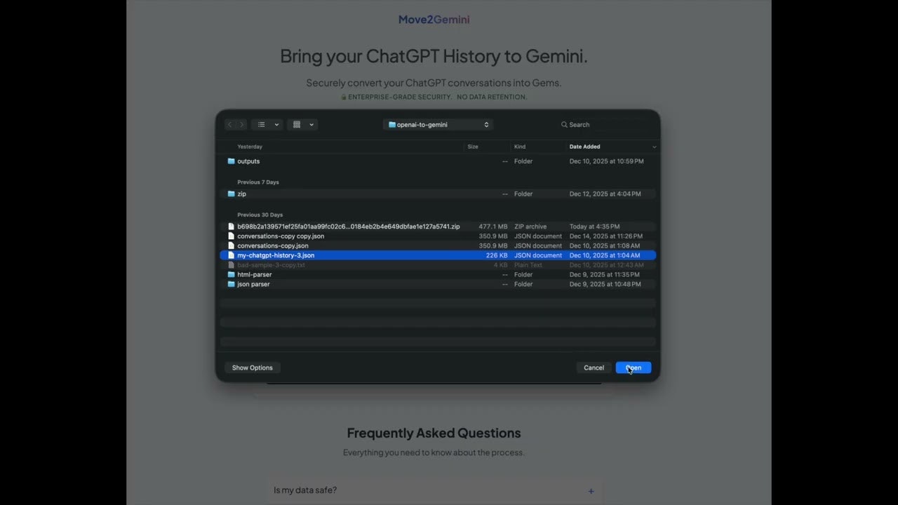 ##概要 Move2Gemini.ioは、ChatGPTの履歴データを安全にGoogle Geminiへ移行・転送するSaaSです。長年積み上げた文脈・コード・創作を失わず、Geminiの2Mコ...