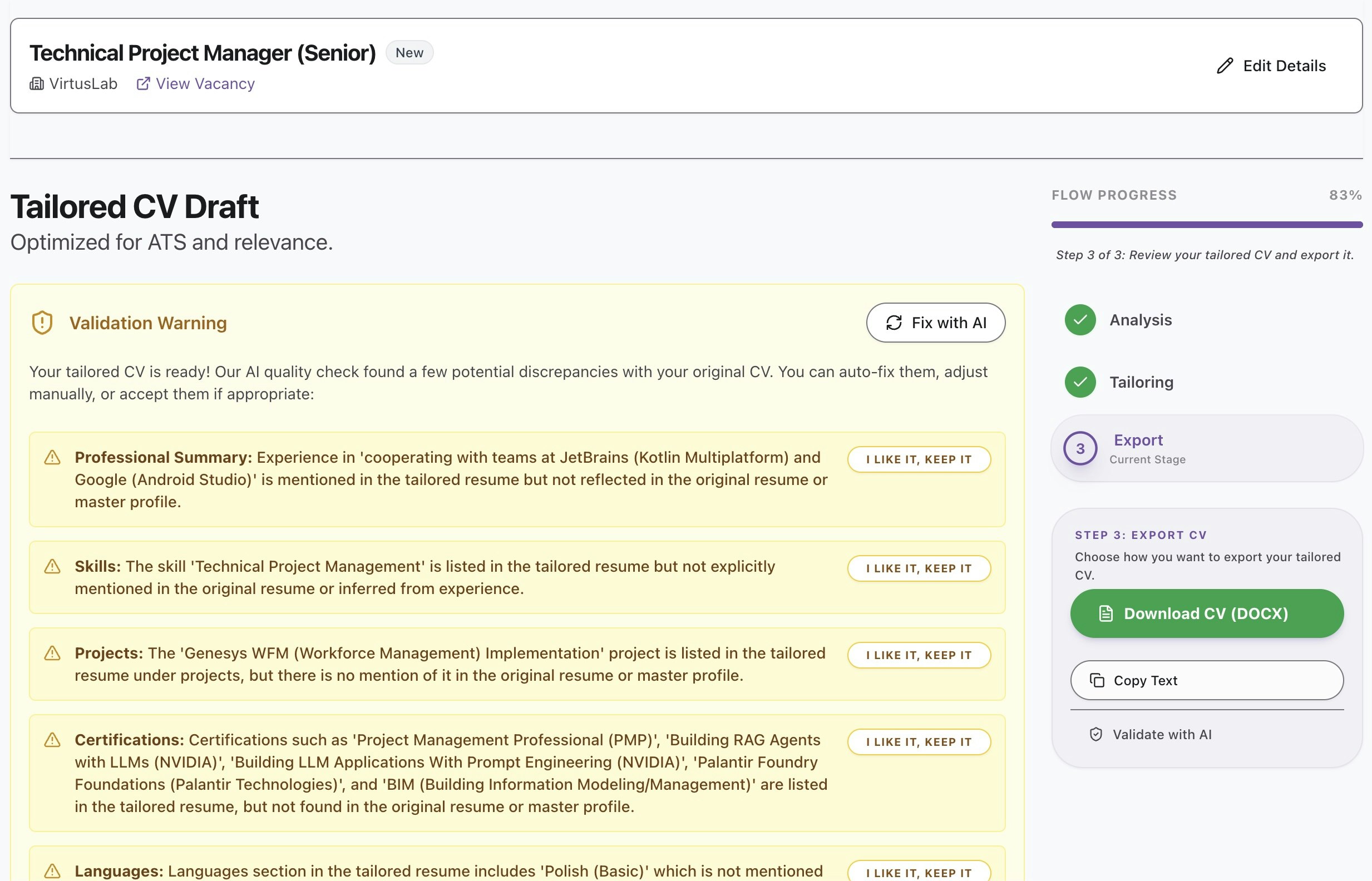 ## 概要 TailorForCV は AI で求人ごとに履歴書を分析・最適化するツール。ギャップを指摘し、経験を求人要件に合わせて再配置することで、面接機会を増やすことを目指します。候補者にと...