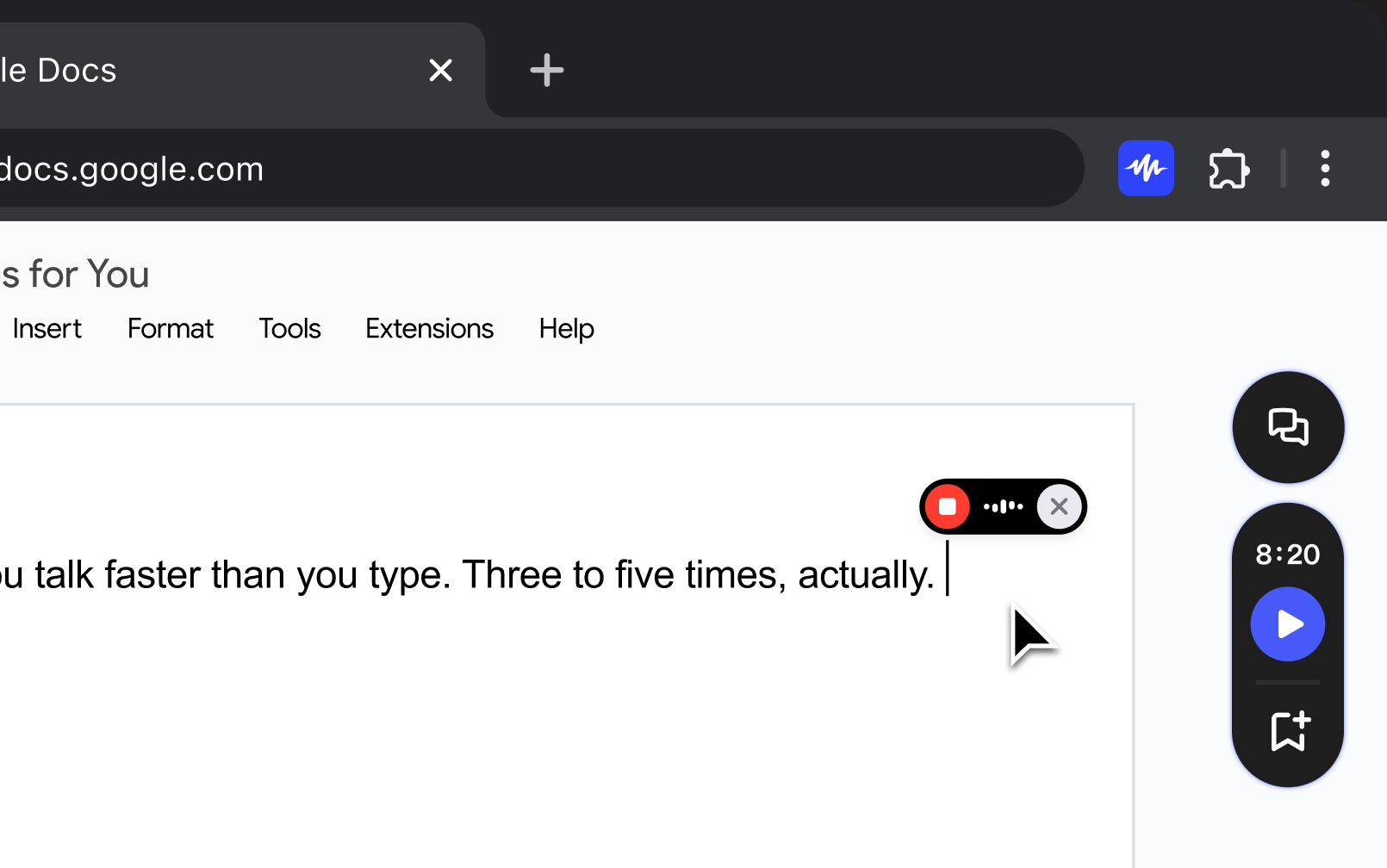 Speechify AI の音声入力ディクテーションは、Chrome拡張を使い Google Docs、Gmail などのウェブエディタと高い互換性を実現します。どこでも無料で音声入力が可能で、...