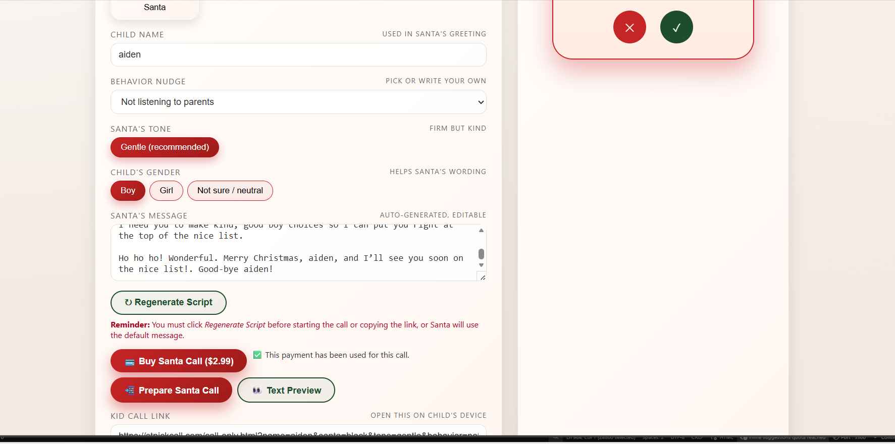 Santa FaceTimeは、サンタが子どもの名前・行動・トーンを反映したパーソナライズ通話を提供する、親向けの魔法のサポートツールです。恐れや恥を使わず、優しく動機づけるメッセージで、子ども...