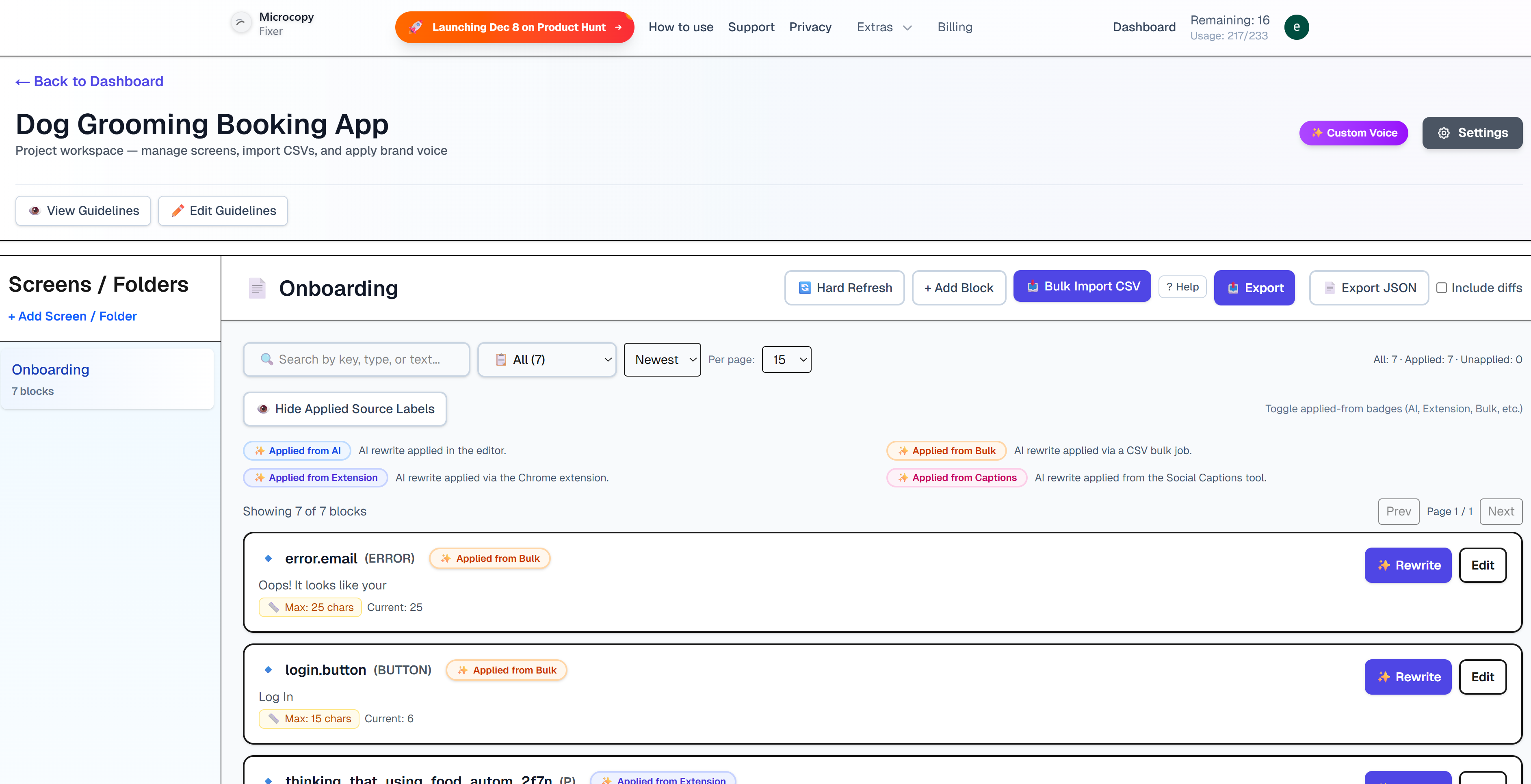 ## プロダクト概要 ブランドの声に合わせた文脈認識リライトAIで、UIコピーを一貫して洗練。ボタン・エラーメッセージ・CTA・ツールチップなどに特化。Chrome拡張とCSVインポートで大量の...