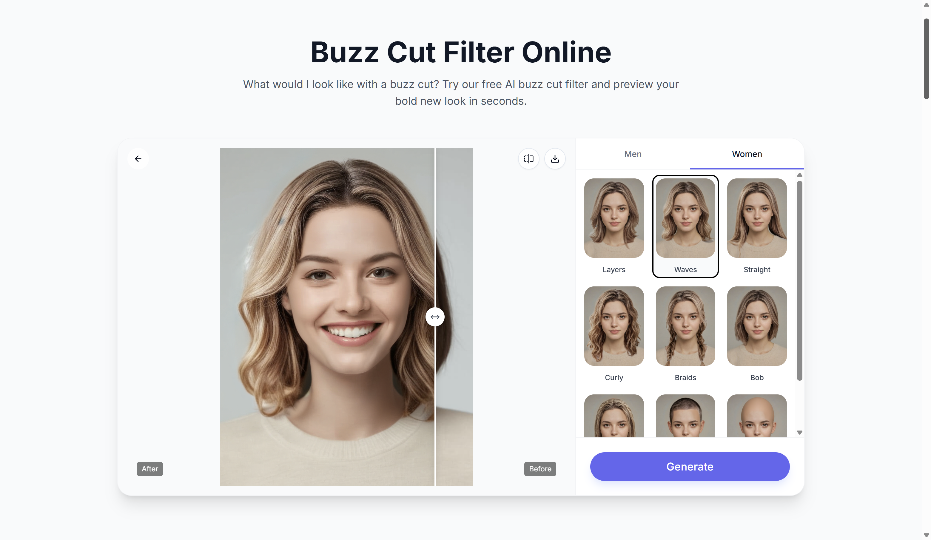 ## プロダクト概要 - AIベースのリアルな髪型試着フィルター。髪の毛だけを差し替え、顔の特徴・ポーズ・服装はそのまま保持するため、本人にそっくりな仕上がり。 - まずはバズカットを中心に提供...