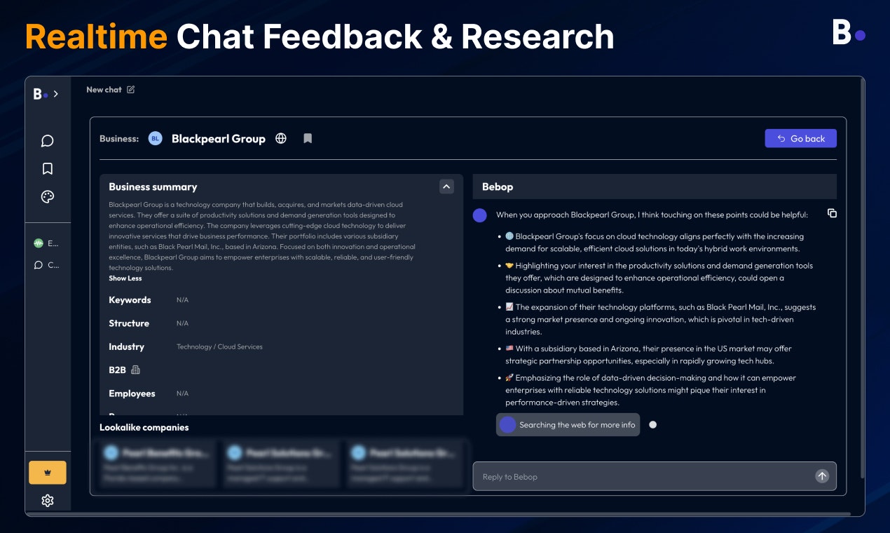 ## 概要 Bebop.aiは、B2Bビジネスに特化した顧客発見プラットフォームです。企業の成長を促進するために、特に中小企業や独立したビジネスオーナーに最適なソリューションを提供します。ウェブ...
