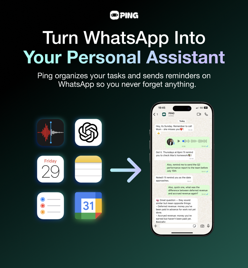 ## 概要 ADHD の人向け WhatsAppベースの個人リマインダーアシスタント、Ping.me。自己管理を助け、忘れがちな情報を整理するツールです。 ## 主な特徴 - ADHD-fir...