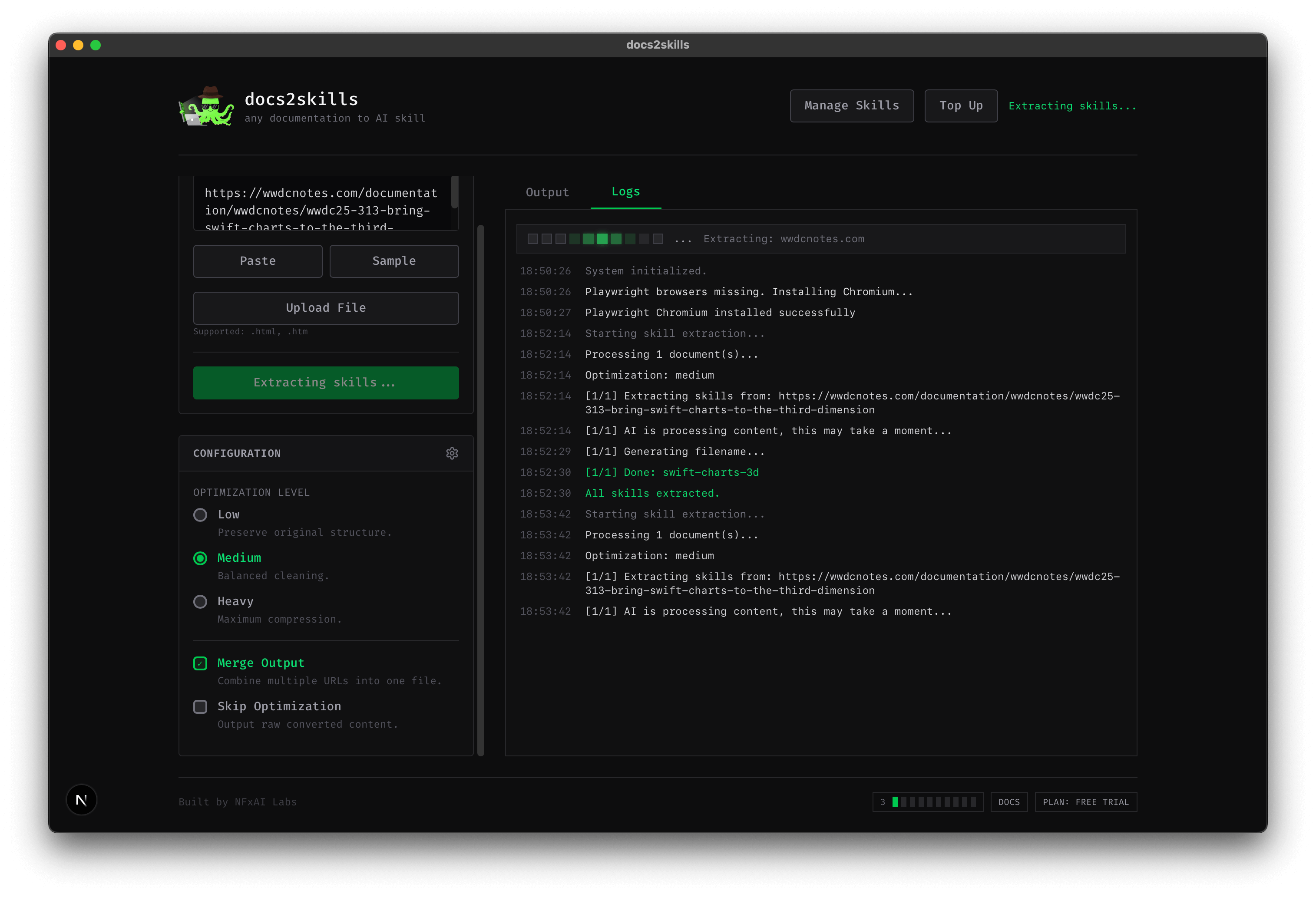 docs2skillsは、ドキュメントを取得・整形・最適化して、エージェントが活用できる高信号のMarkdownスキルへ変換する統合ツールです。低/中/高の最適化レベルを選択可能で、ノイズを抑え...