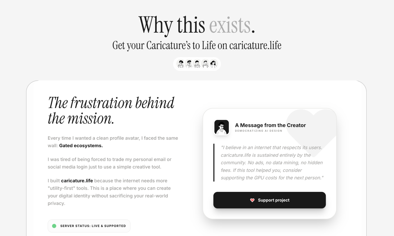 ログイン不要、追跡なしのミニマルな似顔絵を作成。