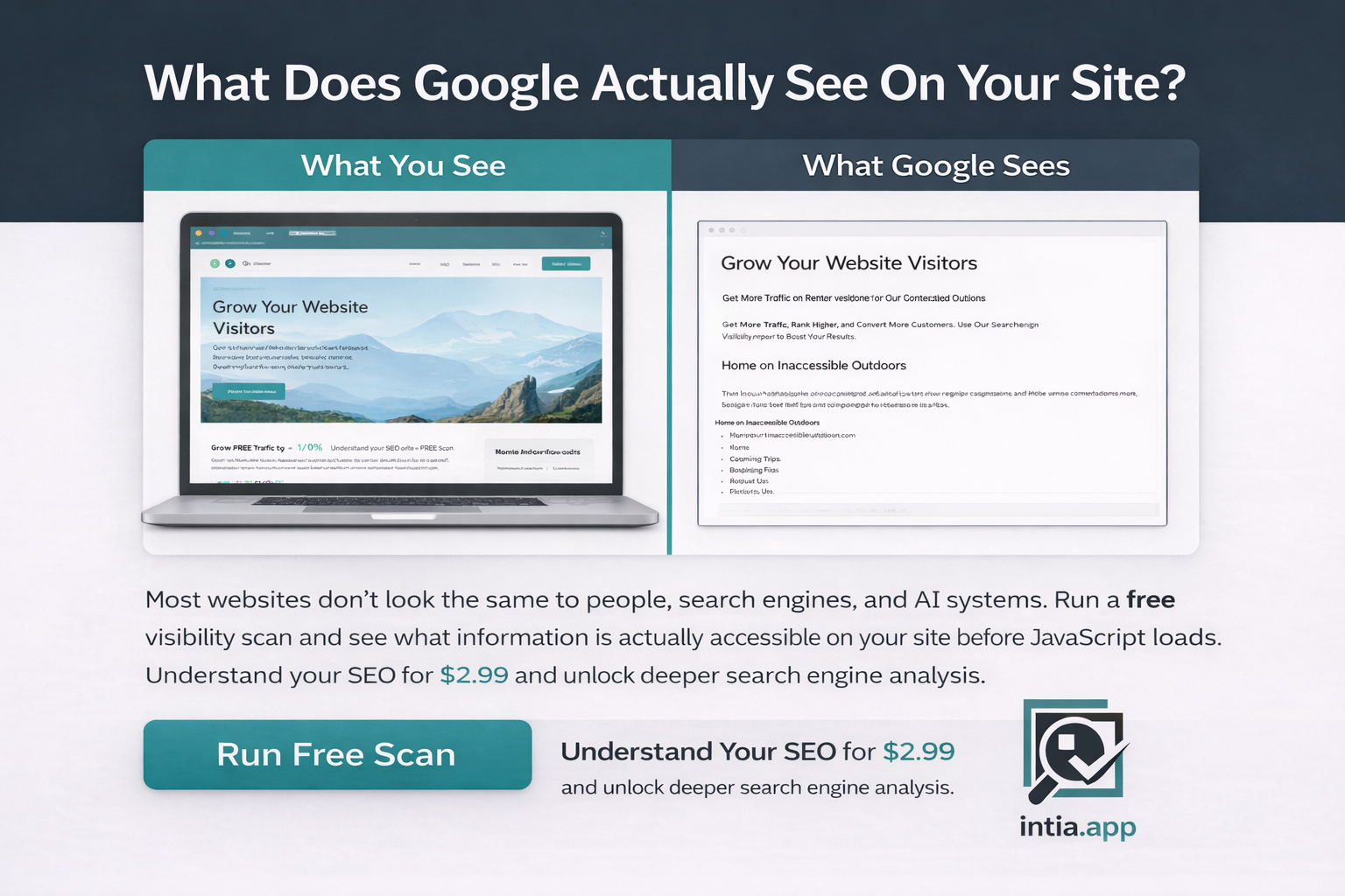 ## 概要 Intia は公開ウェブがサイトで実際に見られる情報を可視化する可視性ツールです。レンダリング可能性、robots.txt の遵守、ログイン障害、ペイウォールを回避せずにスキャンしま...
