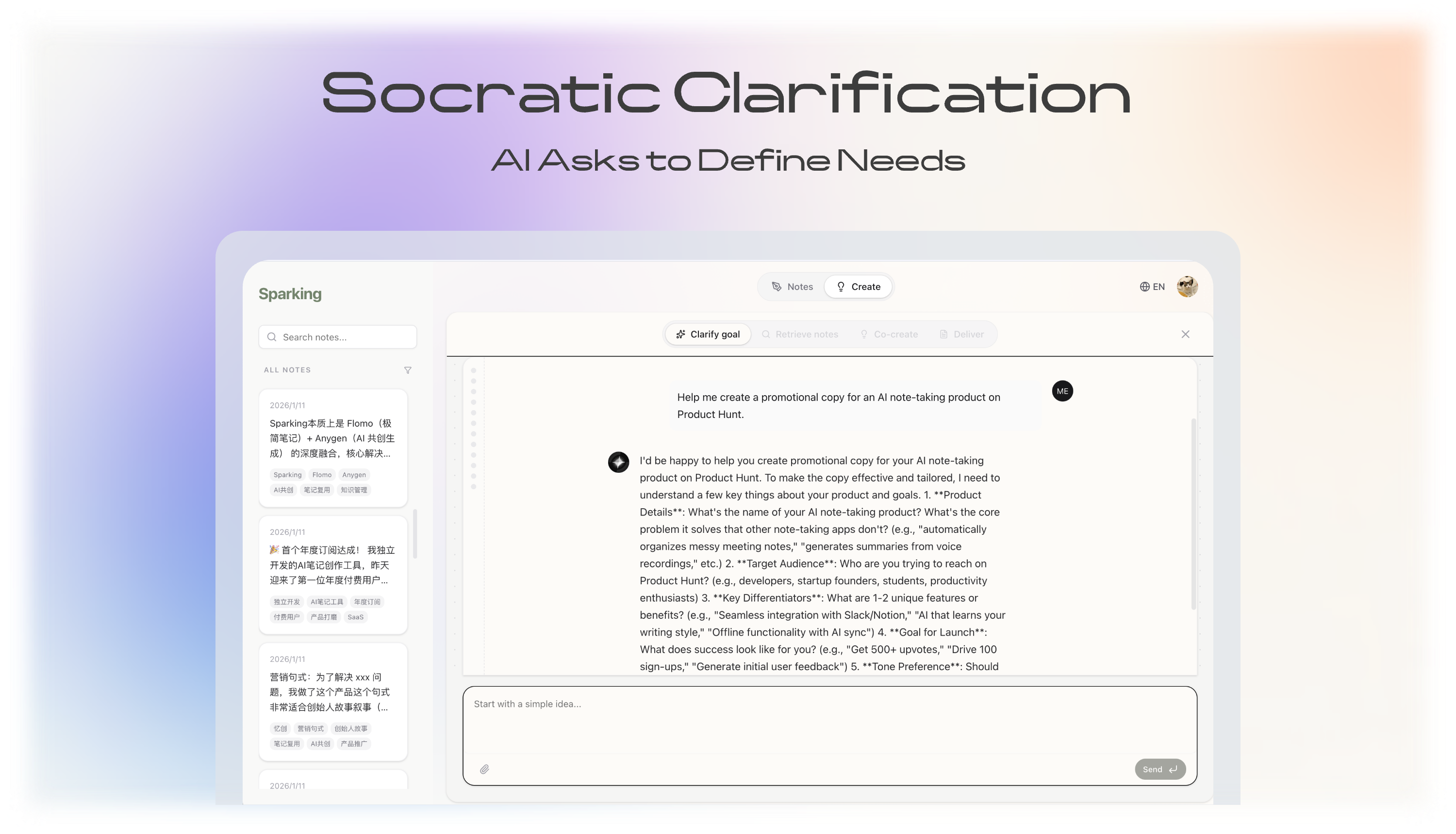 ##概要 Sparkingはノート取りとAI創作を統合したプラットフォーム。AIスマートタグ付けでノートを自動整理・連携し、ソクラテス対話でアイデアを深掘り、アクティブ材料想起で過去ノートをリア...