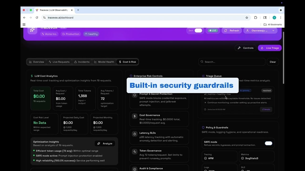 TraceVoxは本番環境のLLM運用を前提にした予測・可観測性プラットフォーム。品質・コスト・信頼性のインシデントを未然に予測し、AIトリアージでプロンプト・ツール・モデル全体の根本原因を特定...
